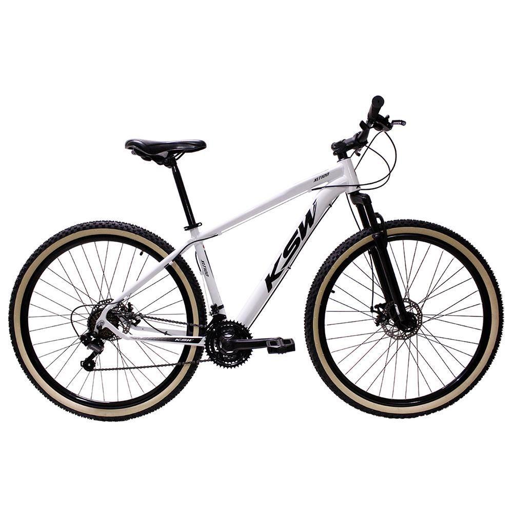 Bicicleta Aro 29 Ksw 21 Marchas Alumínio Cambio Shimano Freio A Disco - Branco -ad Preto - 17 Branco -ad PretoA Bicicleta KSW, é a escolha perfeita para os iniciantes do mountain bike, possuindo um dos melhores Custo-benefício do mercado, e com uma qualidade surpreendente.Dentre os atributos, os que mais se destacam são: Componentes em alumínio: Torna o produto mais leve. Freios a Disco: Frenagem segura e com baixo custo de Manutenção. Suspensão Dianteira: Amortecimento que Reduz impactos durante o trajeto. Além de trazer vários benefícios para a saúde, e para a Vida!Quadro 29 A6061 KSW XLT 100 Alumínio. Abraçadeira Quadro c/ Blocagem Alumínio. Suporte de Guidão Alumínio. Canote Selim sem Carrinho. Guidão Mtb Alumínio.Cambio Traseiro 7v Shimano. Cambio Dianteiro 3v Index. Alavancas Rapid Fire 21v Index.Freio a Disco Mecânico 160mm. Pedivela Aço Revestido Nylon 24/34/42D Index. Roda Livre 7v 14/28D Index. Corrente fina 7v Index.Garfo 29 Suspensão 100mm. Pneu 29 Mtb Multi-terreno Preto-Bege. Pedal Freestyle Nylon Inglês.Cubo em aço c/ Blocagem. Aros Aero Parede Dupla. Manopla Borracha Mtb.Movimento Central Roller Selim Mtb.Peso (Tam 17): 14,93kgRecomendações: Certifique-se do tamanho do quadro antes de efetuar a compra, recomendamos que escolha o tamanho de quadro de acordo com a altura do usuário, conforme tabela da última foto do anúncio.Montagem: A bicicleta vai montada e revisada, por motivo de acomodação na embalagem, são retirados selim, pedais, guidão e roda dianteira. A montagem final é de responsabilidade do cliente, sugerimos a mesma seja feita por uma oficina especializada (a empresa não se responsabiliza pela montagem e regulagem final da mercadoria).Garantia: 1 ano para o quadro e 3 meses para os componentes (ambos contra de fabricação). A garantia não cobre por mau uso ou pela montagem inadequada do produto. Imagem meramente ilustrativa. Marca: KSW | modelo: MTB | Suspensão: Dianteira | Aro: 29 | Marchas: 21 | Cor: BRANCO -AD PRETO