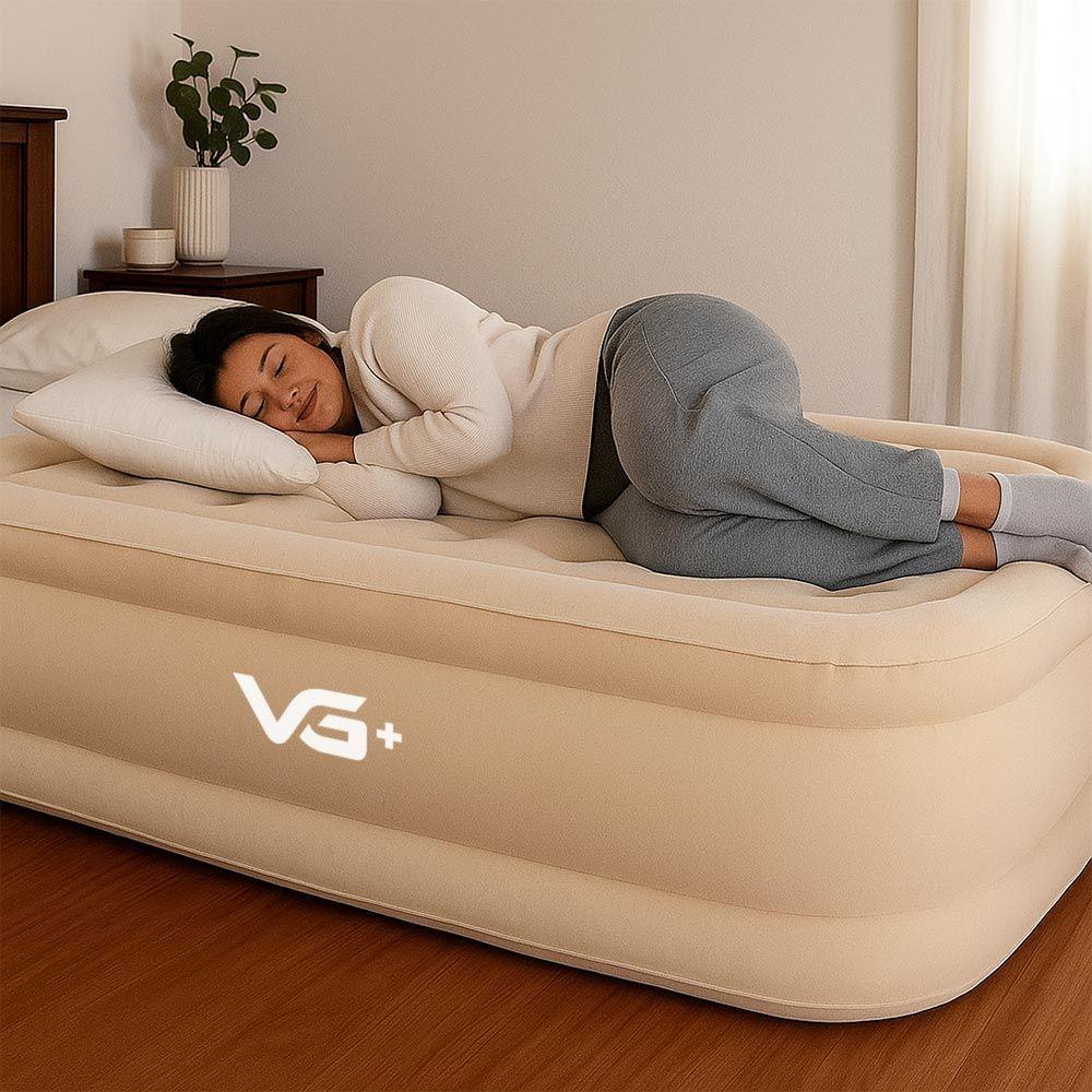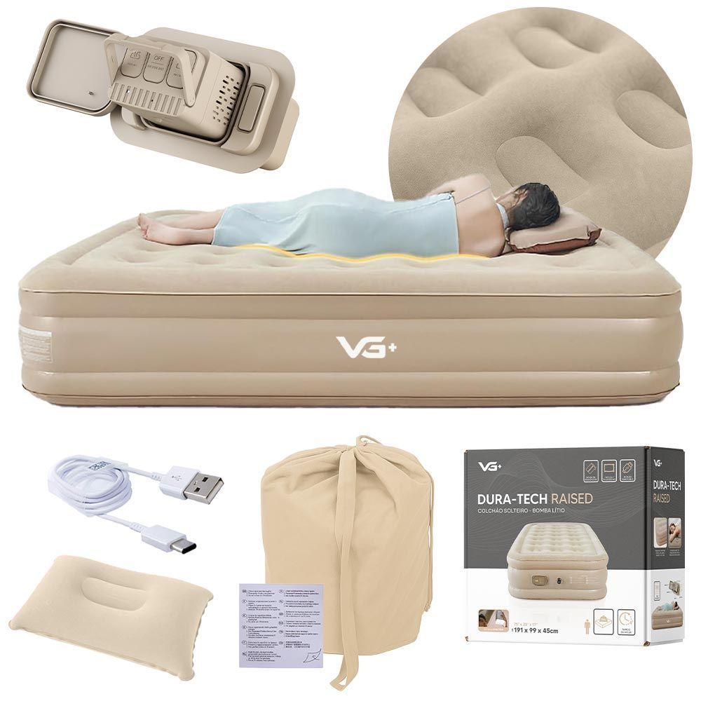 Colchão Inflável Solteiro Raised Com Inflador Lítio Usb Vg Plus BegeDurma com o conforto de uma cama real, onde você estiver! O Colchão Inflável Solteiro Raised VG Plus foi projetado para oferecer o máximo de praticidade, durabilidade e conforto. Com altura elevada, ele proporciona uma experiência de sono mais estável, ergonômica e agradável ? ideal para quem não abre mão de dormir bem, até fora de casa. A bomba de ar de lítio removível foi desenvolvida para facilitar sua rotina, oferecendo mobilidade e autonomia no uso. Nada de tomadas ou extensões: com bateria recarregável via USB, ela garante inflagem rápida com apenas um toque.Caracteristicas:- Ref. RH-1012;- Marca. VG PLUS;- Cor. Bege;- Suporta até 136Kg;- Material flocado tendo maior estabilidade e conforto em suas noites de sono;- Colchão versátil, utilize para viagens, acampamentos, hóspedes e visitas, onde e quando precisar;- Material aveludado e confortável para sua pele e descanso;- Colchão com fonte de alimentação sem fio, com bateria de lítio recarregável via cabo USB-C, eliminando a necessidade de cabos ou tomadas durante o uso;- Bomba Lítio com lanterna integrada (3 níveis de iluminação);- Acompanha válvula para enchimento manual;- Uma carga completa pode inflar e desinflar cerca de 4 a 8 vezes (4000mAh de carga) ;- Bomba removível, use-a para inflar qualquer inflável que precisar.- Funções da bomba lítio: Desinflar, Desligar e Inflar;- Rápido de inflar, levando aproximadamente 4 minutos para estar totalmente cheio;- Bolsa de transporte inclusa, leve o colchão para onde precisar;- Ao carregar a bomba lítio, use o cabo original, não use o cabo do telefone celular ou outro cabo não original.- Acompanha 1 travesseiro inflável para melhor comodidade;- Dimensões Colchão: 191 x 99 x 45 cm;- Dimensões Caixa: 38 x 31 x 19 cm;Itens Inclusos- 1 Colchão inflável solteiro- 1 Bomba Lítio de Ar- 3 Bicos de tamanhos diferentes- 1 Bolsa de armazenamento- 1 Travesseiro inflável- 1 Kit de reparo- 1 Cabo de carregamento USB- 1 Manual de instruções90 DIAS DE GARANTIA DE FABRICAÇÃO.**ATENÇÃO! Não infle em excesso. NÃO UTILIZE COMPRESSOR.Colchão Inflável Solteiro Raised com Inflador LÃtio USB VG Plus Bege