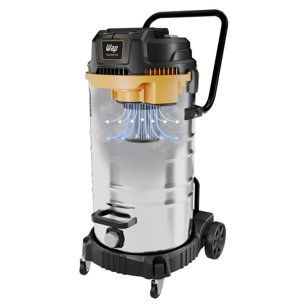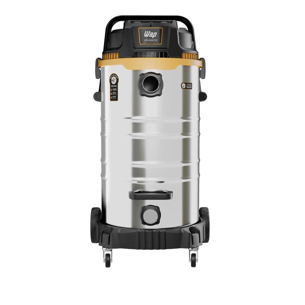 Aspirador De Pó E Água WAP GTW Inox 70L 220VVersatilidade, força bruta e eficiência para uma limpeza completa Para uma limpeza profissional, o Aspirador de Pó e Água WAP GTW INOX 70I possui 70 litros de capacidade, e uma combinação de características e equipamentos que podem transformar sua rotina. Os dois motores e 2800W de potência proporcionam desempenho profissional, com alta eficiência e agilidade.A tecnologia Easy Cleaning, um sistema integrado de autolimpeza do GTW INOX 70I, possibilita que o aspirador limpe seu próprio filtro sozinho, removendo poeira e detritos, evitando o contato direto com a sujeira. O dreno de Água facilita a descarga de líquidos após a limpeza de áreas molhadas. Equipado também com um bocal de sopro, o aspirador se torna um produto 3 em 1, que pode ser usado para soprar folhas ou encher infláveis.Seus 70 litros de capacidade total, sendo 47,3 litros para líquidos e 50,5 litros para sólidos, garante uma limpeza potente em grandes áreas industriais e comerciais de uma só vez! O aspirador possui um cabo elétrico de quatro metros e mais dois extensores, o que torna possível a movimentação em até oito metros, sem a necessidade de trocar de tomada. Também tem quatro rodas e uma alça de transporte ergonômica, para facilitar a mobilidade, mesmo com sua capacidade total cheia.Para personalizar ainda mais sua experiência, o GTW INOX 70I acompanha nove acessórios sendo eles duas extensões, filtro HEPA, filtro de tecido lavável, filtro espuma, bico escova, bico canto, bico múltiplo escova e bico múltiplo rodo, para adaptar o aspirador diversos tipos de limpeza diferentes. Para facilitar seu uso, o porta-acessórios mantém todas as ferramentas e bocais sempre organizados e à mão.Seu barril de inox torna o aspirador mais durável e resistente, mesmo em limpezas pesada e de longa duração. Ideal para carros, pisos, tapetes, estofados e colchões, o Aspirador de Pó e Água WAP GTW INOX 70I foi feito para te acompanhar no dia a dia.WAP | Deixa tudo mais fácil.Voltagem: 220VVácuo: 170 para 127 V / 170 para 220V (Mbar) Potência elétrica: 2800W Tipo de filtro: Filtro Espuma / Filtro de Tecido lavável Capacidade útil do Recipiente para Sólidos: 50,5L Tem Certificado Inmetro?: Sim Frequência: 60 Classe de isolação: 2 Dimensões do produto (C x L x A): 45 x 50 x 90 cm Componentes: 1 Filtro Hepa; 1 Filtro espuma ;1 Filtro de tecido lavável Código WAP: FW010523 (110V) / FW010524 (220V) Capacidade Útil do Recipiente de Sujeira para Água: 47,3L Voltagem: 110V / 220V Conteúdo da embalagem: GTW Inox 70I + Acessórios + Manual de Instruções. Peso líquido: 10,5 kg Material: Metal e polímeros Níveis de filtragem: 2 Comprimento da mangueira: 2,5m Em breve: Sim Código EAN: 7899831336890 (110V) / 7899831336906 (220V) Dimensões da caixa (C x L x A): 52 x 50 x 90 cm Peso bruto: 16,9 kg Acessórios: 1 Mangueira de sucção 2,5 m; 2 Tubos Extensores; 1 Bico Múltiplo escova; 1 Bico Múltiplo rodo; 1 Bico Escova; 1 Bico Canto Comprimento cabo elétrico: 4 Aspira Água?: Sim Cor: Inox, Preto e Amarelo Índice de Proteção: IPX4