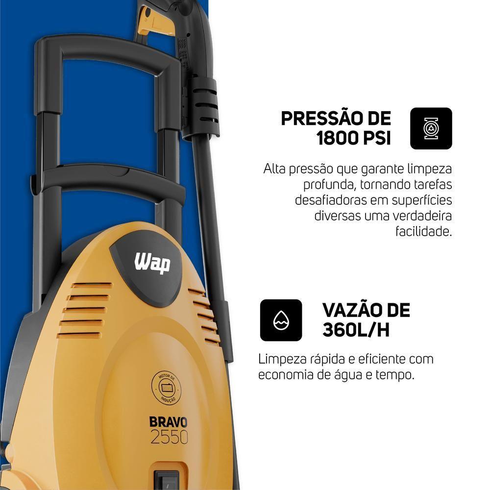 Desobstruidora De Alta Pressão 1700W 1800PSI WAP Bravo Ultra 2550 110VA Desobstruidora WAP BRAVO ULTRA 2550 é uma Máquina que encara a sujeira pesada, além de desentupir canos, calhas e tubulações com facilidade utilizando jato de Água! Potente e robusta, a Desobstruidora e Lavadora de Alta Pressão WAP Bravo ULTRA 2550 é a melhor opção para limpar sujeiras pesadas e profundas com rapidez e agilidade, economizando tempo e até 80% de Água se comparada à mangueira comum. Com motor de indução, bico turbo, potência de 1700W e pressão máxima de 1800 PSI é o equipamento perfeito para a remoção de níveis incrustados de sujeira nos mais diversos tipos de pisos e superfícies.Equipada com alça e rodas que facilitam o transporte, a WAP Bravo ULTRA conta com cabo elétrico de 5 metros, mangueira de alta pressão de 5 metros, trava de segurança da pistola, bico regulável (concentrado ou leque), aplicador de detergente e o sistema stop total, que corta o fluxo de Água e a energia do motor ao soltar o gatilho, poupando energia e aumentando a vida útil do motor. Além disso, a versão WAP ULTRA vem equipada com uma incrível mangueira desentupidora de 2 metros.A lavadora de alta pressão conta também com motor de indução e pistões em aço inox que conferem mais durabilidade para o produto. Para deixar o produto mais completo, a máquina vem equipada também com o bico turbo que possibilita a limpeza de sujeiras pesadas de forma mais prática e rápida. A Desobstruidora Lavadora de Alta Pressão WAP Bravo ULTRA 2550 vem com um porta-acessórios que acomoda pistola, baioneta, lança e junto ao corpo da lavadora, otimizando a movimentação da máquina. E, para o trabalho ficar ainda mais fácil e dinâmico, ela vem equipada com o engate rápido, para você montar e desmontar a mangueira em um clique, sem a necessidade de usar ferramentas.Se você procura agilidade e praticidade para o seu dia a dia não perca mais tempo e garanta já a sua Desobstruidora Lavadora de Alta Pressão WAP Bravo ULTRA 2550.WAP tem que ser da WAP!Tamanho da mangueira: 5 m Tipo de plugue: 3 pinos Corrente elétrica / Amperagem: 20 A Dimensões do produto (C x L x A): 25 x 30,5 x 80 cm Classe de isolação: I Voltagem: 110V ou 220V (escolher no momento da compra) Cor: Amarelo com Preto Comprimento cabo elétrico: 5 m Peso bruto: 15 kg Acessórios: 1 Pistola de alta pressão com trava de segurança; 1 Baioneta com conexão rápida; 1 Lança com bico regulável (leque e concentrado); 1 Bico turbo; 1 Aplicador de detergente; 1 Mangueira de alta pressão de 5 metros; 1 Engate rápido; 1 Agulha de limpeza do bi Tipo da mangueira: Mangueira de nylon Potência elétrica: 1700 W Conteúdo da embalagem: Máquina, acessórios descritos, manual. Código EAN: 7899831301515 (110V) / 7899831301522 (220V) Código WAP: FW007652 (110V) / FW007653 (220V) Pressão máxima: 1800 PSI Shampoozeira: Sim Área de limpeza: 80 m² Vazão: 360 L/h Tipo do bico: Bico turbo Tipo de sujeira: Moderada Motor: Indução Frequência: 60Hz Comprimento mangueira desentupidora: 2 m Peso líquido: 11 kg Dimensões da caixa (C x L x A): 84 x 37 x 31,5 cm Componentes: Bomba axial com cabeçote de alumínio; Pistões em aço inox; Cabo elétrico de 5 metros; 2 Rodas para transporte; Alça para transporte; Filtro de Água; Suporte para acessórios; Sistema Stop Total.