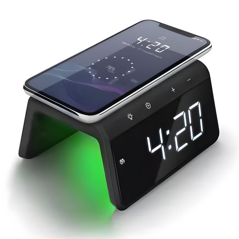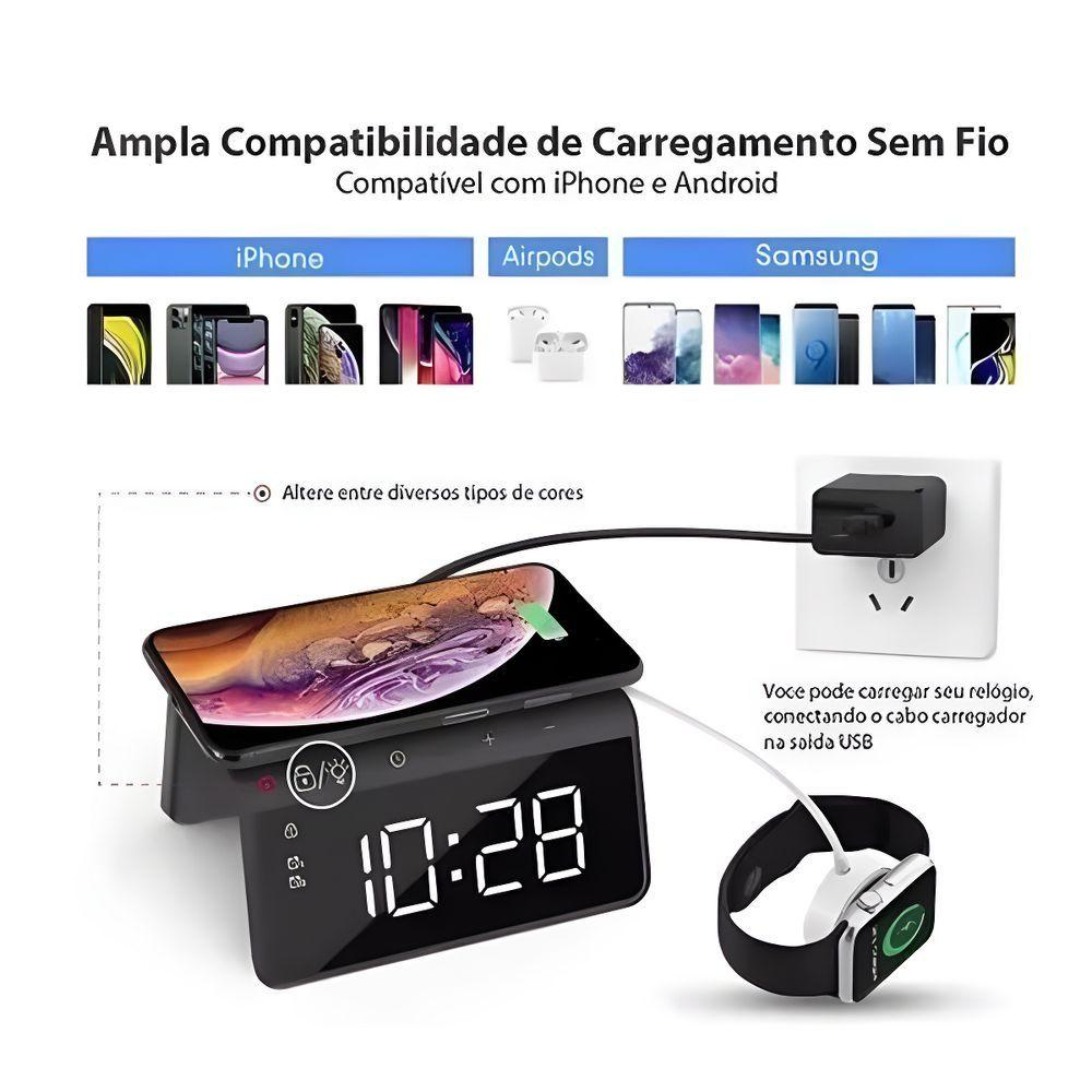 Carregador Indução + Relógio Despertador (preto)REGISTRO ANATEL 18852-23-16178Base de Carregamento Sem Fio com Relógio Digital, Despertador e Luminária RGB – com , Samsung, AirPods e iWatchModernize seu ambiente e facilite sua rotina com a nova Base de Carregamento Sem Fio 3 em 1, equipada com relógio digital, despertador e luminária em LED multicolorida. Registrada na Anatel sob o 18852-23-16178, essa estação multifuncional foi projetada para oferecer praticidade, organização e estilo, sendo perfeita para uso na cabeceira, mesa de trabalho ou cozinha. com diversos dispositivos que utilizam carregamento por indução, como iPhones, celulares Samsung, AirPods e Watch, a base oferece carregamento rápido e , eliminando a necessidade de cabos e reduzindo o desgaste das entradas dos aparelhos.Características do Produto:- Carregamento por indução: com , Samsung, AirPods e outros dispositivos com tecnologia Qi- Relógio digital com despertador: ajuste de hora e alarme integrados para manter sua rotina organizada- Luminária LED com até 8 cores: iluminação suave com ajuste de brilho, ideal para leitura, relaxamento ou como luz ambiente- Design moderno e compacto: visual elegante que combina com qualquer ambiente- Carregamento rápido e : até 15W de potência, com tecnologia que protege contra superaquecimento e sobrecarga- Conectividade USB adicional: porta traseira para conectar o carregador do iWatch (não incluso)Compatibilidade:- 8, 8 Plus, X, XR, XS, XS Max, 11, 11 Pro, 11 Pro Max, 12, 12 Pro, 12 Pro Max, 13, 13 Pro, 13 Pro Max- AirPods 3 e Pro- Watch Series 2 ao 8 e SE (com uso de cabo conectado à porta USB traseira)- Samsung Galaxy Note10, Note9, S10, S10+, S9, S9+, S8, S8+, S20, S20+, S21- Dispositivos com tecnologia de carregamento Qi de outras marcasEspecificações Técnicas:- Material: ABS de alta resistência- Dimensões: 140 x 117 x 73 mm- Entrada de energia: 5V/3A – 9V/3A – 12V/2A- Saídas de carregamento: 15W / 10W / / 5W (por indução), USB: 5W máx.- Fonte recomendada: adaptador 9V/2A ou 9V/3A (não incluso)- Requisitos adicionais: adaptador com saída USB-C para uso com fonte turbo do Benefícios:- Organização: um único dispositivo para carregar múltiplos eletrônicos- Estética: design moderno com luz ambiente personalizável- Funcionalidade: ideal para uso diário em casa, no escritório ou viagens- Praticidade: elimina o uso de cabos separados e mantém o ambiente limpo e organizado- : protege seus dispositivos contra danos causados por carregamento inadequadoConteúdo da Embalagem:- 1 base de carregamento sem fio com relógio e luminária- 1 cabo USB- 1 manual do usuário- Embalagem Dúvidas Frequentes:1. O produto está disponível para ?- Sim, temos todos os itens em estoque prontos para em até 24h úteis após a compra.```2. A compra é segura?- Sim, somos oficial com todas as garantias oferecidas pela plataforma, além de suporte especializado e garantia de 90 dias contra de fabricação.```Observações:- Produto apenas com dispositivos que possuem carregamento sem fio por indução- Utilize sempre adaptadores recomendados para evitar falhas ou danos- Produto pode apresentar variações de tonalidade conforme o loteCom a Base de Carregamento Sem Fio 3 em 1 com Relógio e Luminária, você une praticidade, tecnologia e sofisticação em um só produto. Ideal para transformar sua rotina com mais eficiência e estilo.REGISTRO ANATEL 18852-23-16178Base de Carregamento Sem Fio com Relógio Digital, Despertador e Luminária RGB – com , Samsung, AirPods e iWatchModernize seu ambiente e facilite sua rotina com a nova Base de Carregamento Sem Fio 3 em 1, equipada com relógio digital, despertador e luminária em LED multicolorida. Registrada na Anatel sob o 18852-23-16178, essa estação multifuncional foi projetada para oferecer praticidade, organização e estilo, sendo perfeita para uso na cabeceira, mesa de trabalho ou cozinha. com diversos dispositivos que utilizam carregamento por indução, como iPhones, celulares Samsung, AirPods e Watch, a base oferece carregamento rápido e , eliminando a necessidade de cabos e reduzindo o desgaste das entradas dos aparelhos.Características do Produto:- Carregamento por indução: com , Samsung, AirPods e outros dispositivos com tecnologia Qi- Relógio digital com despertador: ajuste de hora e alarme integrados para manter sua rotina organizada- Luminária LED com até 8 cores: iluminação suave com ajuste de brilho, ideal para leitura, relaxamento ou como luz ambiente- Design moderno e compacto: visual elegante que combina com qualquer ambiente- Carregamento rápido e : até 15W de potência, com tecnologia que protege contra superaquecimento e sobrecarga- Conectividade USB adicional: porta traseira para conectar o carregador do iWatch (não incluso)Compatibilidade:- 8, 8 Plus, X, XR, XS, XS Max, 11, 11 Pro, 11 Pro Max, 12, 12 Pro, 12 Pro Max, 13, 13 Pro, 13 Pro Max- AirPods 3 e Pro- Watch Series 2 ao 8 e SE (com uso de cabo conectado à porta USB traseira)- Samsung Galaxy Note10, Note9, S10, S10+, S9, S9+, S8, S8+, S20, S20+, S21- Dispositivos com tecnologia de carregamento Qi de outras marcasEspecificações Técnicas:- Material: ABS de alta resistência- Dimensões: 140 x 117 x 73 mm- Entrada de energia: 5V/3A – 9V/3A – 12V/2A- Saídas de carregamento: 15W / 10W / / 5W (por indução), USB: 5W máx.- Fonte recomendada: adaptador 9V/2A ou 9V/3A (não incluso)- Requisitos adicionais: adaptador com saída USB-C para uso com fonte turbo do Benefícios:- Organização: um único dispositivo para carregar múltiplos eletrônicos- Estética: design moderno com luz ambiente personalizável- Funcionalidade: ideal para uso diário em casa, no escritório ou viagens- Praticidade: elimina o uso de cabos separados e mantém o ambiente limpo e organizado- : protege seus dispositivos contra danos causados por carregamento inadequadoConteúdo da Embalagem:- 1 base de carregamento sem fio com relógio e lum