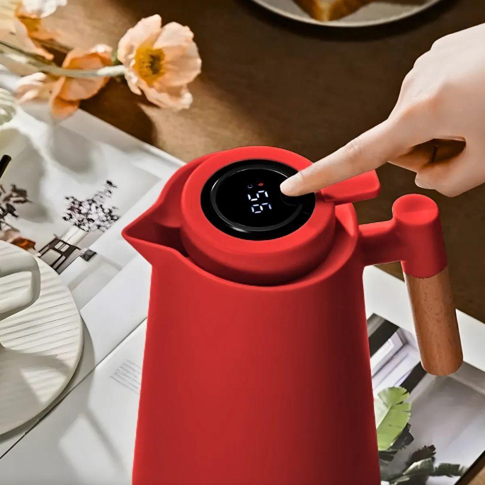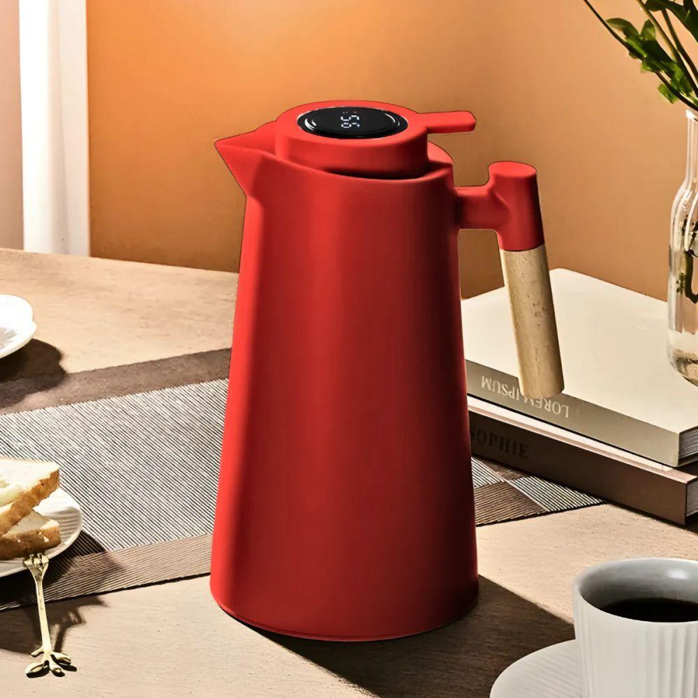 Garrafa Térmica Digital 1 Litro – Cabo Madeira, Display De Temperatura E Conservação Quente/frio Vermelha