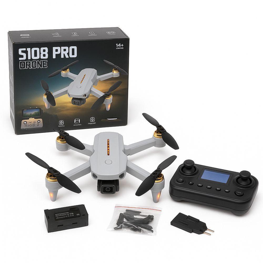 Drone S108 Pro Com Câmera Hd/4k E Controle Com Tela IntegradaDrone S108 Pro com Câmera HD/4K e Controle com Tela IntegradaO Drone S108 Pro combina portabilidade, tecnologia e praticidade em um único equipamento. Seu design dobrável e leve facilita o transporte, enquanto os recursos inteligentes garantem uma experiência completa para iniciantes e usuários avançados.Características PrincipaisCâmera HD/4K: registre fotos e vídeos aéreos com ótima definição.Controle remoto com tela integrada: visualize em tempo real as imagens e informações do voo.Bateria de longa duração: autonomia de até 15 minutos por carga.Funções inteligentes: decolagem e pouso automáticos, modo sem cabeça, retorno automático e estabilização de voo.LEDs de sinalização: maior segurança e orientação, inclusive em voos noturnos.Design dobrável e portátil: prático para transportar em viagens e passeios.BenefíciosFácil de pilotar, ideal até para iniciantes.Portátil e leve, pronto para qualquer aventura.Permite capturar imagens únicas de ângulos aéreos.Excelente custo-benefício para lazer ou pequenos projetos.O que vem na caixa1 Drone S108 Pro1 Controle remoto com tela integrada1 Bateria recarregável + 1 bateria extraHélices extrasCabo de carregamento USBManual do usuárioEspecificações TécnicasBateria: lítio recarregável, 1200mAh, até 15 min por cargaTempo de recarga: ~100 min via USBControle remoto: frequência 2.4 GHz, alcance de 80 a 120mTela integrada: exibe dados do voo e transmissão ao vivoO Drone S108 Pro é a escolha perfeita para quem deseja explorar novos ângulos e registrar momentos inesquecíveis com praticidade e qualidade.ANATEL: Código de homologação 08025-21-10677