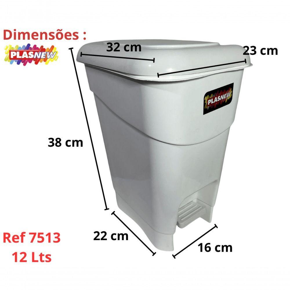 Coletor Cesto Lixeira De Pedal 12 Lt Plasnew BrancoLixeira Com Pedal e Tampa Branca 12 Litros rA Lixeira Plástica Quadrada com Pedal 12 Litros é utilizada para dispensar seu lixo da cozinha, banheiro, ou dejetos com facilidade sem ter contato com o recipiente evitando o risco de contaminação, sendo própria também para consultórios, farmácias, hospitais.Contém Pedal Para abertura e Fechamento da Tampa.ESPECIFICAÇÕES TÉCNICASMaterial: Plástico PolipropilenoMarca: PlasnewDescrição:Material: PlásticoCor: BrancaMedidas CxLxA: 31x22x37 cmCapacidade: 12 Litros