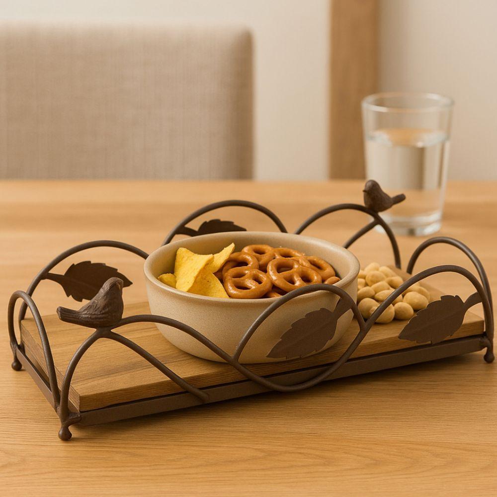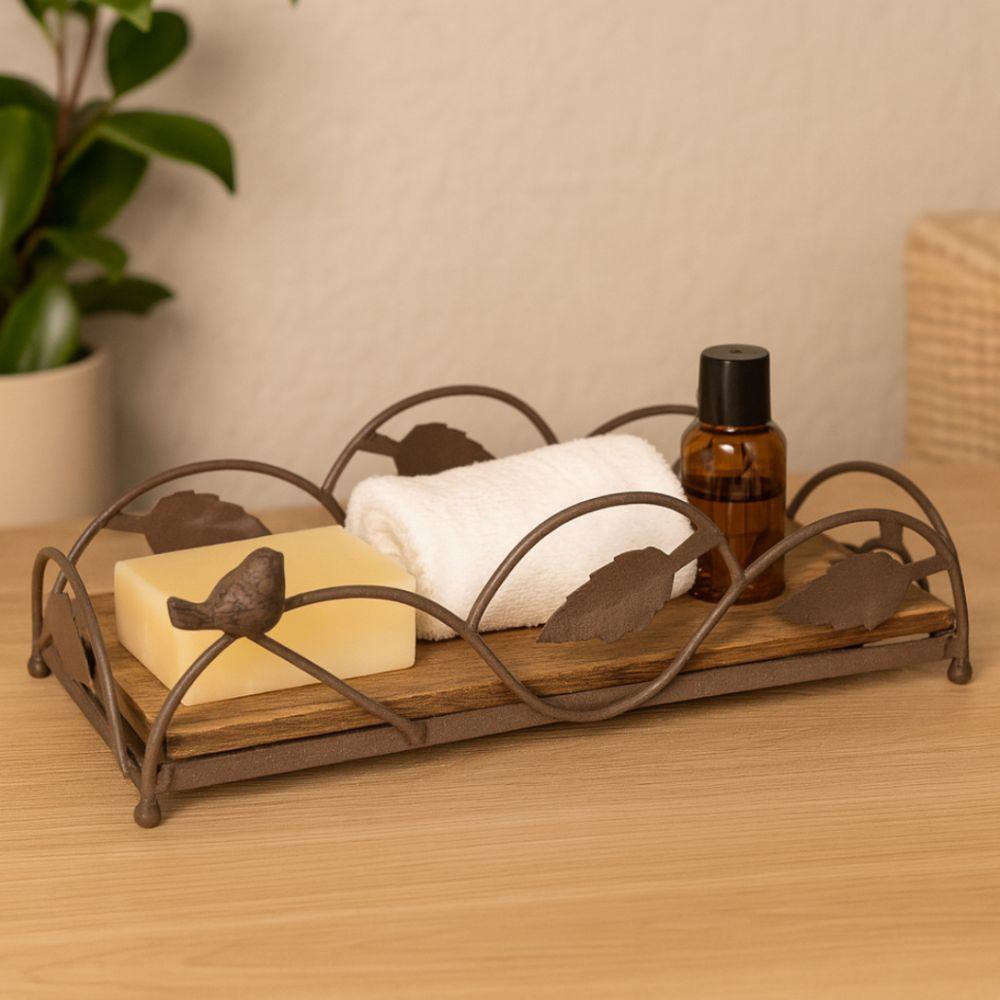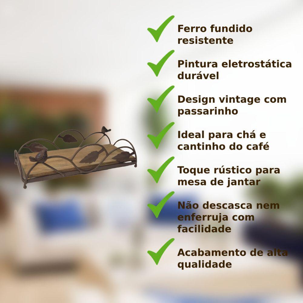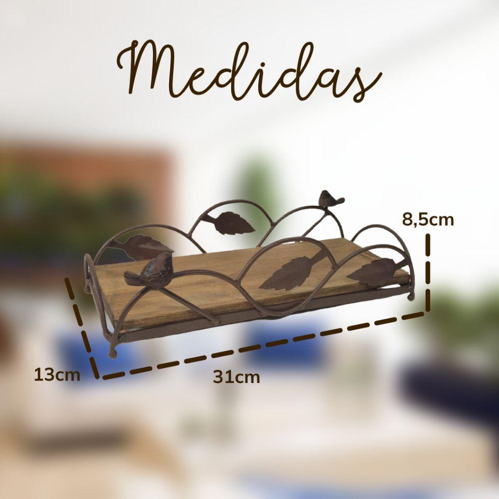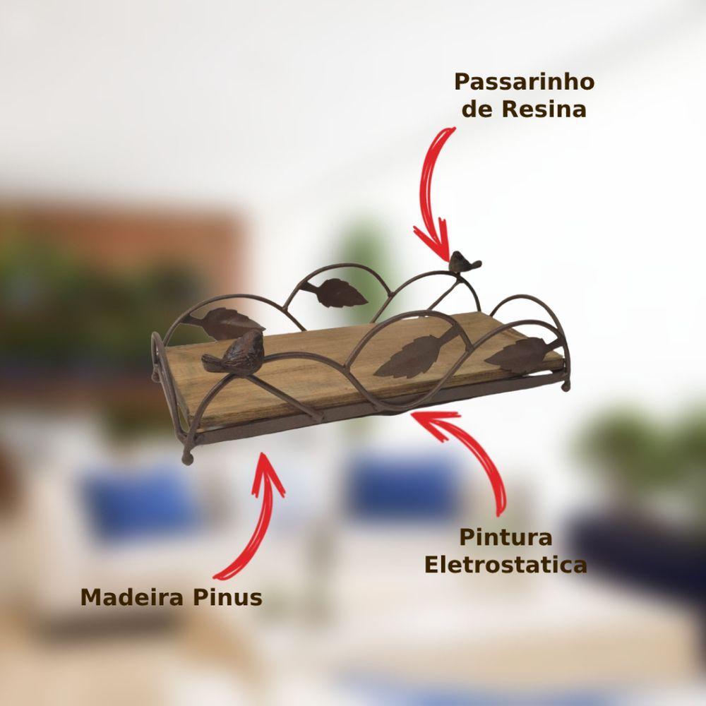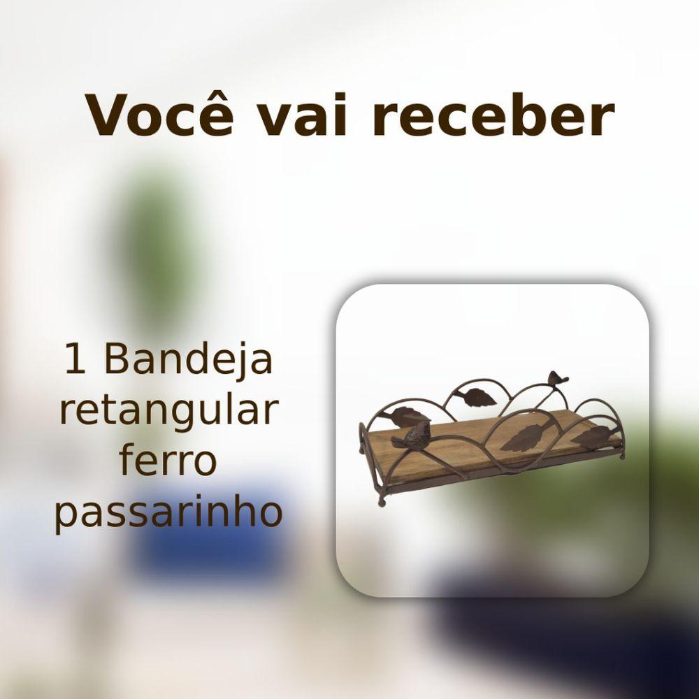 Bandeja Retangular Ferro PassarinhoBandeja Retangular Rústica Decorativa Ferro Madeira Com Pássaros Folhas Para Mesa Só Art'sA Bandeja Retangular Rústica Decorativa Ferro Madeira Com Pássaros Folhas Para Mesa Só Art's é uma peça ideal para compor a decoração de mesas, aparadores e buffets com muito charme e elegância. Seu design combina rusticidade e sofisticação, sendo uma excelente opção para quem valoriza detalhes artesanais e exclusivos. Confeccionada com estrutura em ferro e base em madeira, a bandeja possui enfeites em formato de pássaros e folhas, que agregam beleza natural e leveza ao ambiente. Além do apelo decorativo, é um item versátil que pode ser na organização de pequenos objetos ou como centro de mesa em ocasiões especiais.Características do produto- Medidas aproximadas: 13 cm de altura x 31 cm de comprimento x 8,5 cm de largura- Estrutura metálica em ferro com acabamento rústico- Base em madeira natural- Detalhes decorativos em formato de pássaros e folhas- Estilo decorativo rústico, ideal para ambientes internos- Produto resistente, fabricado com materiais de qualidade- Design exclusivo e acabamento artesanal- Uso recomendado: decoração de mesas, bandejas para servir ou organizar objetos pequenos- Fácil de limpar e manter, ideal para uso contínuo no dia a diaVocê vai receber em sua casa01 Bandeja Retangular Rústica Decorativa Ferro Madeira Com Pássaros Folhas Para Mesa Só Art'sProduto Marca Só Art'sBullet Points (com foco em objeções e conversão)- Perfeita para decoração de mesas, aparadores ou buffets, trazendo um toque rústico que valoriza qualquer ambiente com naturalidade e charme.- Ideal para organizar objetos pequenos, como velas, chaves ou pequenos arranjos, sem abrir mão da estética e funcionalidade no dia a dia.- Estrutura em ferro garante resistência e durabilidade, enquanto a base em madeira proporciona leveza visual e toque artesanal exclusivo.- Detalhes decorativos em pássaros e folhas realçam o estilo rústico, ideal para quem busca harmonia entre natureza e design em sua decoração.- Produto de fácil manutenção: basta um pano seco ou levemente umedecido para conservar o acabamento e prolongar sua vida útil.- Transforme sua mesa em um espaço acolhedor e encantador com um item único e feito com carinho ? porque sua casa merece o melhor.