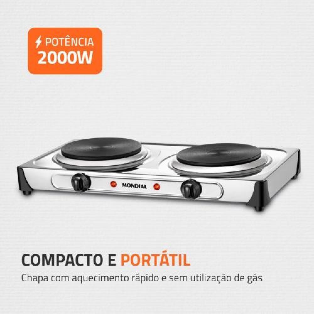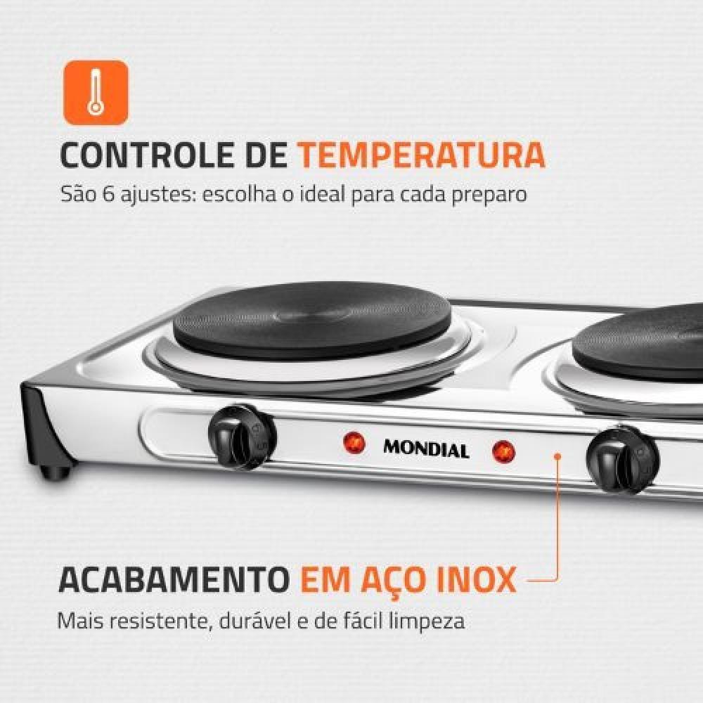 Fogão 2 Bocas Mondial Elétrico Fast Cook Fe-03 Inox 110VPrepare deliciosas receitas, com praticidade, em qualquer lugar! O Fogão Elétrico Fast Cook Dual Mondial possui duas chapas com aquecimento rápido e sem utilização de gás, totalizando 2000W de potência. Conta com 6 ajustes de temperatura para você escolher a ideal para cada tipo de preparo, como carnes, sopas, legumes e outros. Saiba mais sobre o FE-03 da Mondial:COMPACTO E PORTÁTIL: Chapa com aquecimento rápido e sem utilização de gás. É fácil de usar e pode ser levado para qualquer lugar. POTÊNCIA DE 2000W: Garante precisão e eficiência na hora do preparo. São 1000W de potência em cada chapa, garantindo aquecimento rápido e mantendo a temperatura por mais tempo. VERSATILIDADE NA COZINHA: Com o fogão elétrico da Mondial você prepara carnes, massas, legumes, sopas e muito mais. CONTROLE DE TEMPERATURA: São 6 ajustes diferentes você escolher o ideal para cada tipo de receita e garantir os melhores resultados. DESIGN EM INOX: Garante beleza, é mais resistente, durável e de fácil limpeza. MAIS : Possui luz piloto que indica o funcionamento do produto e termostato de . UM ANO DE GARANTIA MONDIAL: A Mondial é a escolha de milhões de consumidores. Mondial, a escolha inteligente!