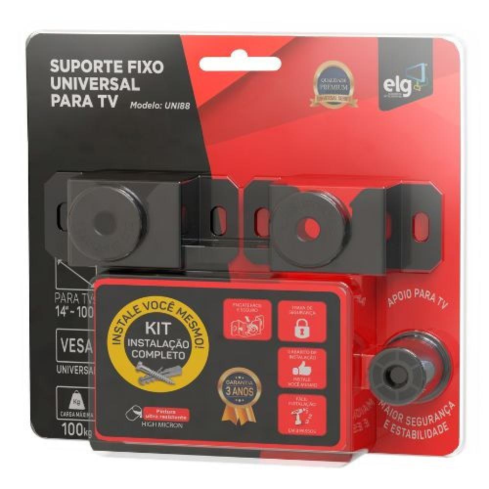 Suporte De Parede Fixo Para Tvs De 14" A 100" Uni88 Preto ElgIndicado para TVs planas e curvas com peso máximo de 100 Kg e compatíveis com padrão de fixação VESA mínimo 75x75mm (horizontal x vertical), normalmente encontrado em televisores de 14 a 100 polegadas.Apresenta perfil slim e design compacto para deixar sua como um quadro decorando o ambiente. Distância da parede de 2,5 cm. Durabilidade, e excelente acabamento o suporte UNI88 possui estrutura de fixação na parede em aço carbono com tratamento anticorrosão e pintura epóxi eletrostática de alta resistência e apoio em nylon reforçado.Em complemento à , as bases de fixação na parede apresentam encaixe com deslocamento lateral, dessa forma reduz a possibilidade de que o televisor possa ser desencaixado involuntariamente. Para uma instalação ainda mais prática e fácil, o suporte conta com gabarito para furação na parede e fixação do mesmo. Acompanha ferragens para instalação na parede e no televisor.Incluso:Ferragens para instalação na parede e na ;Gabarito de instalação na parede e manual de instruções.