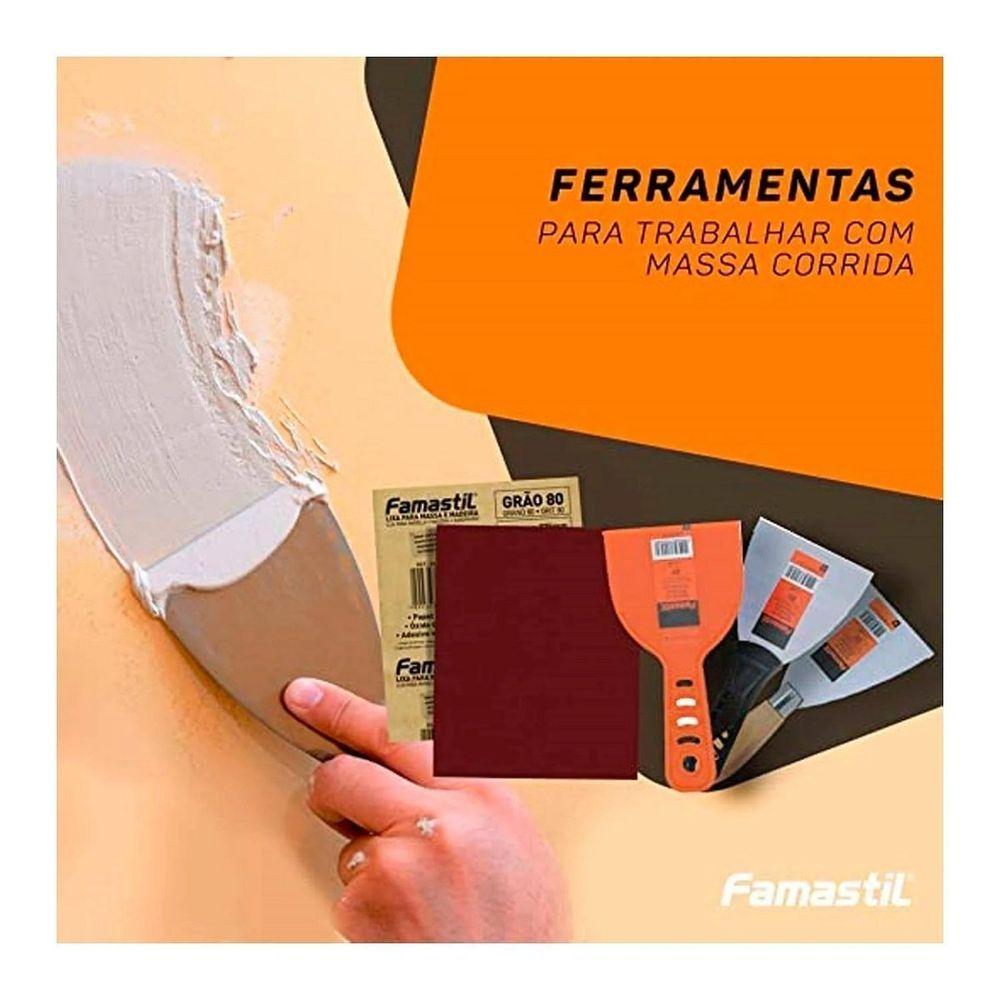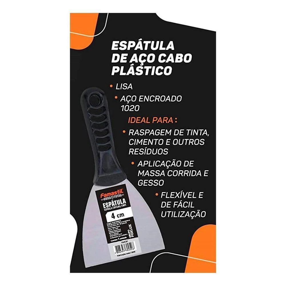 Espatula De Aco Lisa Cabo Pvc 4 Cm FamastilEspátula de Aço Encruado 1020 com Cabo Plástico Ergonômico FamastilA Espátula de Aço Famastil é a ferramenta ideal para quem busca agilidade e qualidade na hora de pintar, reformar ou realizar reparos domésticos. Produzida em aço encruado 1020 de alta resistência, possui cabo plástico ergonômico que proporciona conforto e praticidade no manuseio. Esta espátula é indicada para raspagem de tinta, cimento e outros resíduos, além da aplicação de massa corrida, gesso e rejunte, facilitando o acabamento em suas reformas.Ficha Técnica- Marca: Famastil- Material da Lâmina: Aço encruado 1020- Material do Cabo: Plástico ergonômico- Aplicação: Raspagem de tinta, cimento, outros resíduos e aplicação de massa corrida, gesso e rejunte- Benefícios: ível, resistente e fácil de usarBenefícios- Alta durabilidade graças ao aço encruado 1020- Cabo ergonômico para maior conforto e controle durante o uso- Versátil para diversas tarefas de raspagem e aplicação na construção- Facilita reparos rápidos com acabamento - Ideal para uso doméstico e Sobre a MarcaA Famastil, pertencente ao Grupo Foxlux, é uma das marcas mais tradicionais do mercado de ferramentas na América do Sul. Desde 1953, oferece produtos de alta qualidade nas linhas de Construção Manual e Jardinagem, conquistando reconhecimento e prêmios, como o Top of Mind na sua categoria de jardinagem.