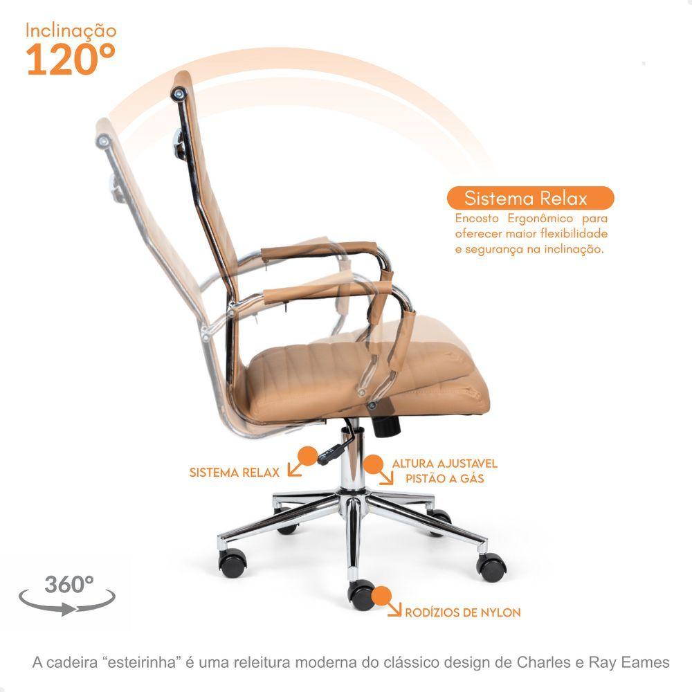 Cadeira Esteirinha De Escritório Presidente Charles Eames P305 BegeCadeira Esteirinha De Escritório Presidente Charles Eames P305 Bege - P305 EsteirinhaCadeira Presidente P305 Estilo Charles Eames ? Conforto e sofisticação no seu dia a dia Transforme seu ambiente de trabalho com elegância e ergonomia. A Cadeira Presidente P305 da é inspirada no design clássico Charles Eames, com encosto tipo esteirinha, acabamento cromado e revestimento em couro sintético de alta qualidade. Desenvolvida para oferecer o máximo de conforto em jornadas longas, ela possui sistema relax, regulagem de altura, rodízios de silicone e apoios de braço acolchoados. Ideal para escritórios modernos, salas de reunião ou home office com estilo. Principais Diferenciais: Encosto alto estilo esteirinha com costura horizontal Sistema relax com inclinação suave e trava de Rodízios de silicone que protegem o piso e deslizam com leveza Base giratória cromada com regulagem de altura a gás Revestimento em couro PU com toque agradável e fácil limpeza Apoio de braços cromado com cobertura acolchoada Design elegante, inspirado na linha Charles Eames Peso máximo recomendado: 100 kg Perguntas Frequentes Essa cadeira é reclinável? Sim, possui sistema relax, que permite leve inclinação do conjunto assento + encosto, ideal para momentos de descanso durante o expediente. Os rodízios são adequados para piso de madeira? Sim. Os rodízios são feitos de silicone, o que evita riscos e oferece deslizamento suave em pisos como madeira, porcelanato ou vinil. O encosto é alto? Sim. O modelo P305 tem encosto elevado tipo esteirinha, que proporciona apoio adequado para as costas e visual executivo. Qual a capacidade de peso suportada? Suporta até 100 kg com . A altura pode ser ajustada? Sim. A cadeira possui pistão a gás para regulagem de altura, adaptando-se a diferentes tipos de mesa e usuário. Sua postura merece respeito. Sua rotina, conforto. Sua cadeira, a P305. Compre agora e sinta a diferença desde o primeiro uso. Características Gerais do Produto: - Cadeira: Ajuste de Altura com Pistão a gás classe 01 - Material da Cadeira: Materiais da estrutura em Metal cromado - Modelo: Cadeira de Escritório Presidente P305 Esteirinha - Peso Suportado: 100Kg - Altura: 116 cm - Largura: 58 cm - Peso: 12,5 Kg - Profundidade: 58 cm Acompanha o produto: - 01 Cadeira P305 Esteirinha - 01 Manual de Montagem - 01 Chave de Montagem Garantia: - Garantia de