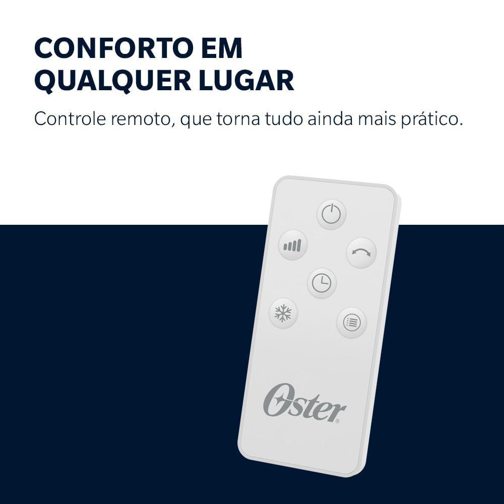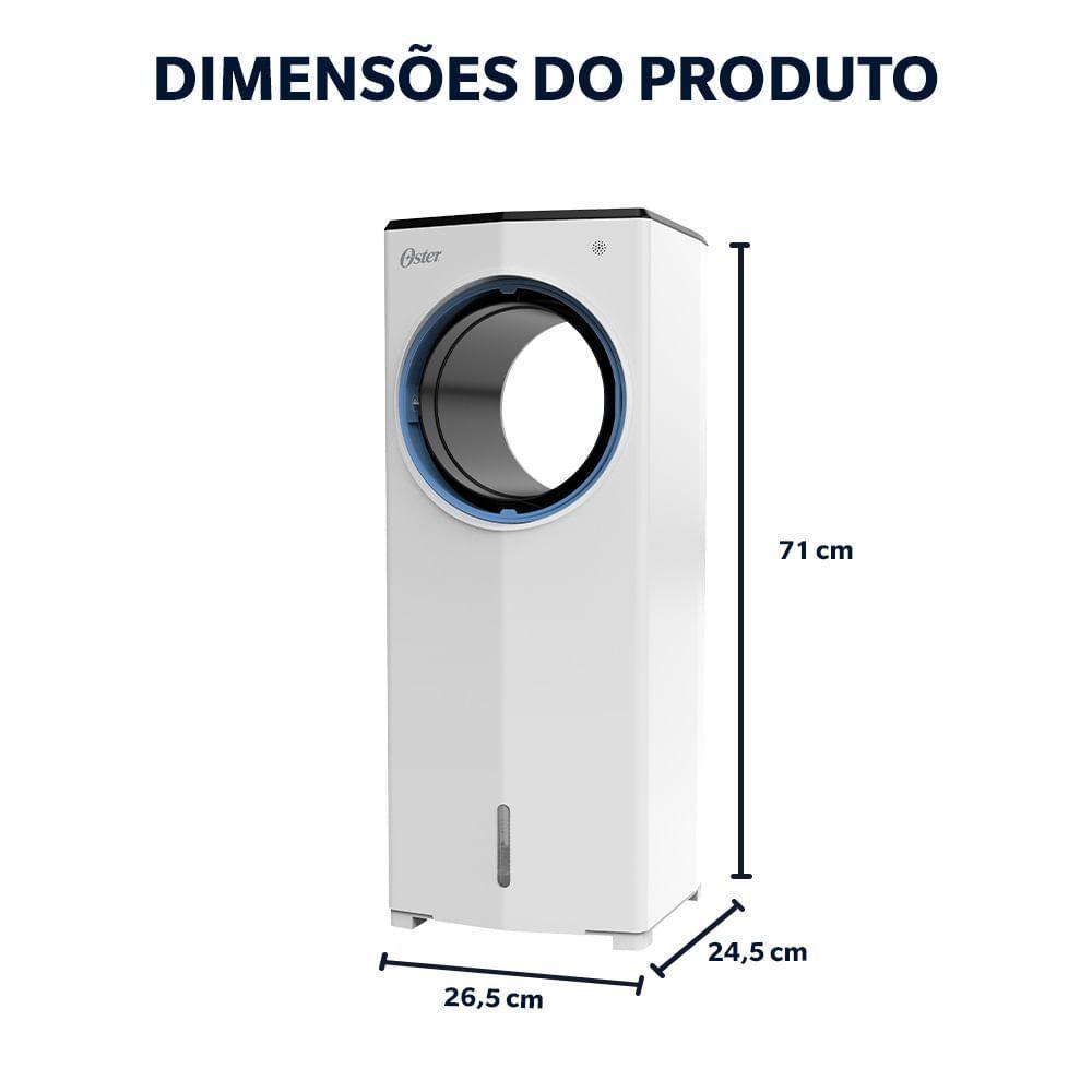 Climatizador De Ar Oster Portátil 4 Em 1 5,3L 110VClimatizador de Ar Portátil Oster 4 em 1 com Controle RemotoDesign, tecnologia e performance no clima certo. Conheça o climatizador Oster portátil, que proporciona um ambiente mais fresco, seja dentro de casa ou em áreas externas. Com um design diferenciado, ele combina com todos os ambientes, trazendo beleza e frescor para onde você for.Principais Características:4 em 1 para Maior Bem-Estar: Climatiza, filtra, umidifica e ventila o ambiente, contando com 3 velocidades de ar, modo noturno e função oscilar para se adaptar às suas necessidades.Tecnologia All Fresh com Rotação 360°: Um exclusivo sistema de rotação que espalha a refrescância de maneira uniforme por todo o ambiente. e Fácil de Limpar: É o primeiro modelo no que não possui aletas ou grades externas, o que o torna mais para crianças e animais, além de facilitar muito a limpeza.Painel Digital e Controle Remoto: Oferece um timer programável de até 7 horas para maior economia de energia e acompanha um controle remoto para sua total conveniência.Compacto e Funcional: Com rodinhas para fácil locomoção e tamanho compacto, pode ser utilizado em qualquer espaço. O reservatório superior de 5,3 litros facilita o reabastecimento.Especificações Técnicas:Marca: OsterModelo: OCLI100-127 Voltagem: 110VCódigo: OCLI100EAN: 7898700211153 (110V)Tipo: Climatizador de Ar PortátilPotência: 80WConsumo: 0,080 kWhCapacidade do Reservatório: 5,3 LitrosAcessórios: 3 bolsas de gelPeso: 5,74 kgDimensões [AxLxP]: 71 x 26,5 x 24,5 cmGarantia: 12 meses