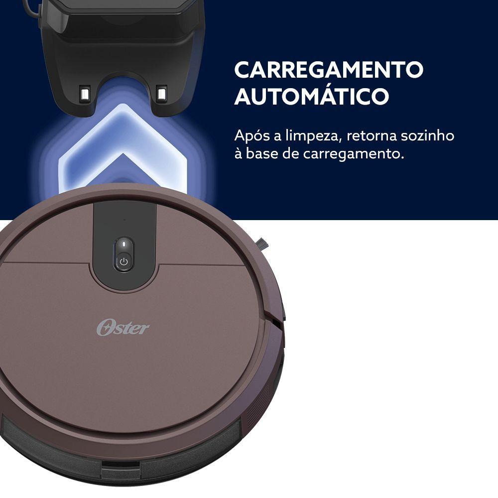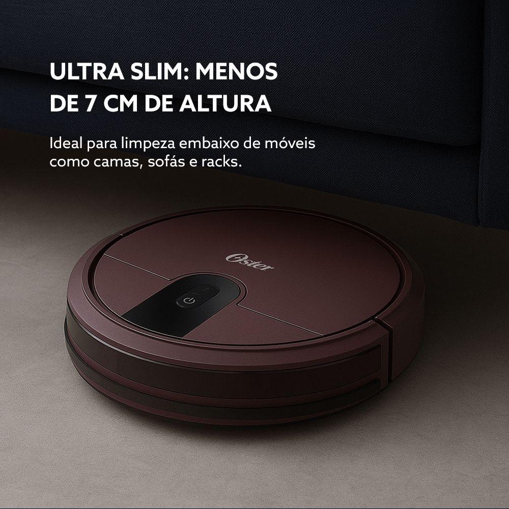 Aspirador Robô Oster Ultra Slim - BatO Aspirador Robô Oster Ultra Slim foi desenvolvido para quem busca praticidade, eficiência e tecnologia na limpeza da casa. Ele realiza a higienização dos ambientes de forma automática, permitindo que você tenha mais tempo livre para aproveitar o que realmente importa, enquanto sua casa permanece sempre limpa.Principais VantagensCarregamento automático: após finalizar a limpeza, o robô retorna sozinho à base para recarregar, garantindo autonomia e praticidade.Design ultra slim: com menos de 7 cm de altura, alcança facilmente áreas sob camas, sofás e móveis, garantindo uma limpeza completa.Sistema triplo de escovas: possui duas escovas laterais e uma escova rotativa na base, ideais para remover sujeiras em diferentes tipos de piso, inclusive tapetes e carpetes.Mop integrado com tanque de água: conta com reservatório embutido de 240 ml que proporciona uma limpeza mais profunda, deixando os pisos polidos e higienizados.Filtro HEPA: retém até 99,9% das partículas de poeira, ácaros e alérgenos, mantendo o ambiente mais limpo e saudável.Controle remoto: permite direcionar manualmente o aspirador, ajustar a sucção, definir horários e escolher modos de limpeza de forma simples e prática.Sensores antiquedas e anticolisão: evitam quedas e batidas, garantindo e durabilidade ao equipamento.Funcionamento silencioso: o baixo nível de ruído permite o uso sem incômodos, inclusive para quem tem pets.Longa autonomia: bateria com duração de até 2 horas, ideal para a limpeza de grandes áreas sem interrupções.Ideal para quem tem pets: remove pelos com eficiência e mantém o ambiente sempre limpo.Reservatório de pó de 380 ml: espaçoso e fácil de esvaziar, facilitando a manutenção.Especificações TécnicasModelo: OASP110-BATCódigo do produto: OASP110Potência: 20 WTensão: Bateria com carregadorDimensões (L x A x P): 330 x 76 x 340 mmPeso: 3,0 kgReservatório de pó: 380 mlTanque de água: 240 mlAutonomia: até 2 horasGarantia: 12 mesesCertificação: Inmetro (OCP SGS)Código de barras: 7898742843053Classificação Fiscal / NCM: Dimensões e EmbalagemEmbalagem individual: 530 x 125 x 400 mm | Peso: 4,45 kgDiferenciaisO Aspirador Robô Oster Ultra Slim combina design moderno, eficiência e tecnologia para tornar a limpeza doméstica mais fácil. Seu sistema de escovas, mop integrado e filtro HEPA garantem resultados superiores. Com operação silenciosa e carregamento automático, ele é perfeito para manter o ambiente limpo todos os dias — especialmente para quem tem animais de estimação.