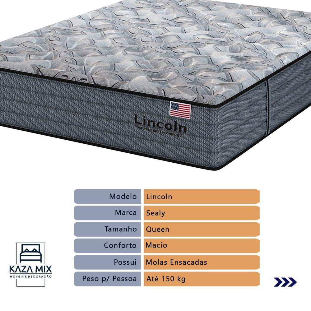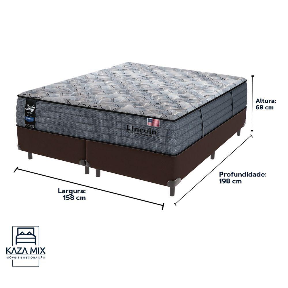 Cama Box Marrom E Colchão Queen Lincoln Molas Ensacadas SealyBem-vindo(a) ao nosso catálogo!Apresentamos a você uma descrição completa sobre esse produto:A marca SealyEntre as personalidades que usam e usaram os colchões da marca Sealy estão a cantora Adele, Rainha Elizabeth II, a apresentadora Ellen DeGeneres e o jogador de basquete LeBron James. Atendendo também os hotéis da Disney, Copacabana Palace, Hard Rock Hotels e outros.Referência na fabricação de colchões de alta qualidade, a empresa foi fundada em 1881. Investindo em tecnologia de ponta e materiais de primeira linha para produzir produtos duráveis e confortáveis, é reconhecida por diversos consumidores famosos em todo o mundo.Modelo:LincolnNível de Conforto:MacioSuporte de peso: 300 quilos (150kg por pessoa)Molas: Molas Ensacadas DSSEspuma: Espuma Hipersoft GelAltura: 33 cmTecido: Malha Margan 365 gO Colchão Lincoln Sealy é o ápice do conforto e sofisticação, criado para quem busca o melhor em qualidade de sono. Este colchão de 33 cm de altura é uma verdadeira obra-prima, combinando a renomada tecnologia de Molas Ensacadas DSS com o suporte adicional da tecnologia Posturepedic. Essa combinação oferece um alinhamento perfeito da coluna e alívio dos pontos de pressão, proporcionando uma experiência de sono revitalizante e tranquila.Com uma camada de espuma Hipersoft Gel, o Colchão Lincoln Sealy eleva o conforto a um novo patamar, garantindo uma sensação de maciez e ajudando a dissipar o calor, mantendo a temperatura ideal durante toda a noite. O tampo em Malha Margan, com 365 g/m², adiciona um toque de frescor e elegância, enquanto a lateral em Jacquard Plano reforça a durabilidade e o visual sofisticado.Além disso, o colchão é equipado com uma camada adicional de fibra siliconada e espuma Soft, com um reforço estratégico no terço central, garantindo suporte extra e conforto incomparável. As bordas firmes ampliam a área útil do colchão, evitando deformações e garantindo que cada centímetro seja aproveitado ao máximo.Com capacidade de suporte de até 150 kg por pessoa, o Colchão Lincoln Sealy não é apenas sinônimo de conforto, mas também de durabilidade e resistência. Eleve sua experiência de sono com este colchão, que combina tecnologia avançada, materiais de alta qualidade e um design elegante, transformando suas noites em momentos de descanso verdadeiramente restauradores.Além de tudo, esse produto acompanha a Cama Box da Kaza Mix e assim se torna um conjunto perfeito para o seu quarto!Marca: Kaza MixCor do Box: MarromTamanho: QueenMaterial dos pés: MadeiraEstrutura: MadeiraPeso máximo recomendado: Até 150kg de cada ladoLargura: 158cmComprimento: 198cmAltura dos pés: 12cmAltura total: 42cmGarantia: 03 mesesSelo Ecologicamente CorretoAtenção:- Antes de finalizar sua compra, recomendamos que verifique se as dimensões do produto são adequadas para serem transportadas pelos elevadores, portas, escadas e corredores de sua residência. Ressaltamos que não nos responsabilizamos pelo transporte do produto por meios específicos, como escadas, guinchos ou içamentos.- É possível que hajam leves variações de cor de acordo com o dispositivo que está sendo utilizado como smartphones, computadores, monitores e outros.