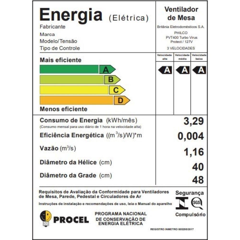 Ventilador Philco Turbo 6 Pás Virus Protect 160W 110VSe refresque com o Ventilador Philco Turbo Virus Protect. Ventilador de mesa, possui hélice com 6 pás e diâmetro de 40cm, sistema oscilante, garantindo um excelente desempenho! Com 160W de potência e 3 velocidades, que variam entre mínima, média e máxima, a eficiência de ventilação com o seu Ventilador Philco está garantida. Além de oferecer inclinação vertical regulável, proporcionando melhor direcionamento do fluxo de ar, a grade do Ventilador é plástica e removível, facilitando a limpeza. O Ventilador é Vírus Protect, ou seja, diminui em até 99% a proliferação de vírus, bactérias e mofo dentro do ambiente, e elimina odores, fumaça e partículas de pólen presentes no ar. Seu fusível térmico de segurança e porta fio garantem praticidade até na hora de guardar. Quer economia de energia? Conte com o Ventilador Philco, pois ele possui classificação energética A para você curtir os dias mais quentes sem se preocupar com a conta de luz.Com o Ventilador Philco Turbo Virus Protect sua casa fica do jeitinho que você gosta!- Hélice de 6 pás- Grade que obedece às normas de segurança (contato com partes móveis)- Oscilação horizontal automática com novo sistema de acionamento (botão integrado à carcaça)- Sistema de articulação para ajuste da inclinação vertical - Porta-fio- Novo sistema de travamento entre grade frontal e traseira- Remoção da grade frontal somente com uso de ferramenta, conforme normas de segurança- Motor com fusível térmico de segurança- Alça na grade traseira para transportar o aparelho.- Sistema com ionizador.Especificações Técnicas:Marca: PhilcoModelo: Virus ProtectEstado: NovoTipo: De mesaCor das Pás: PretoQuantidade de pás: 6Potência (W): 160 WDiâmetro (cm): 40Função repelente: SimMaterial das Pás: PlásticoAltura do produto: 65,5 cmLargura do produto: 47,5 cmComprimento do produto: 37 cmPeso do produto: 3,235 kgAltura com embalagem: 59 cmLargura com embalagem: 50 cmComprimento com embalagem: 19 cmPeso com embalagem: 3,853 kgGarantia (Dias): 360Observação: Somente faturamos para o nosso consumidor final, ou seja, não faturamos pedidos para CNPJ por este portal de vendas;