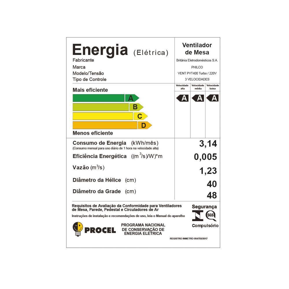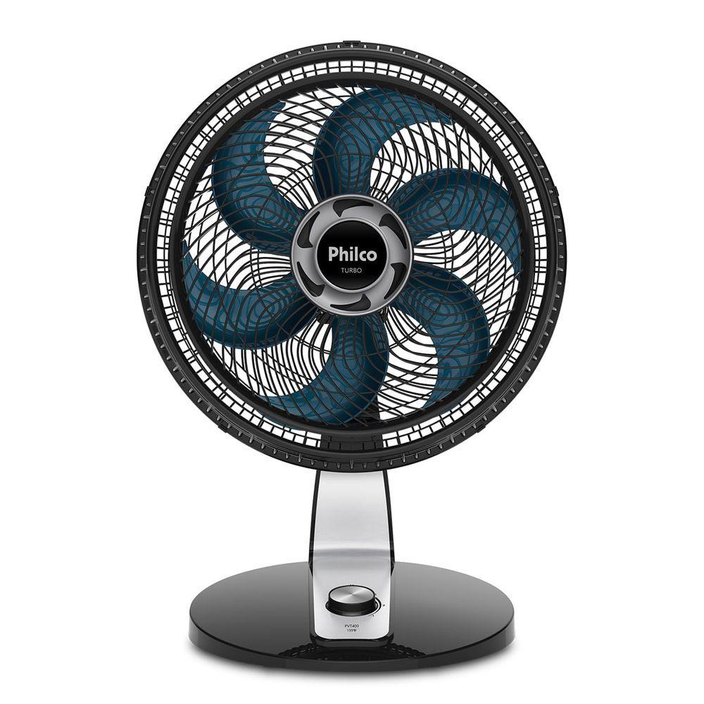 Ventilador Philco 2 em 1 Turbo 160W PVT400AZ 220VO Ventilador Philco 2 em 1 Turbo 160W PVT400AZ possui hélice com 6 pás e diâmetro de 40cm que garantem um excelente desempenho de ventilação.Conta ainda com 160W de potência e 3 velocidades, que variam entre mínima, média e máxima, além de sistema oscilante que permite ampla distribuição do ar no ambiente. Na hora da limpeza, pode ficar tranquilo, pois sua grade plástica é removível, facilitando o processo. Com inclinação vertical regulável você garante melhor direcionamento do fluxo de ar do seu Ventilador Philco, enquanto o fusível térmico proporciona maior segurança e durabilidade. Ventilador Philco 2 em 1 Turbo 160W PVT400AZ é silencioso e deixa o ambiente perfeito em todos os momentos!- 3 velocidades- Hélice com 6 pás- Grade que obedece às normas de segurança (contato com partes móveis)- Oscilação horizontal automática com novo sistema de acionamento (botão integrado ao corpo)- Novo sistema de articulação para ajuste da inclinação vertical (sem borboleta)- Pode ser fixado na parede- Porta-fio- Novo sistema de travamento entre grade frontal e traseira- Remoção da grade frontal, conforme normas de segurança- Motor com fusível térmico de segurança- Alça na grade traseira para transportar o aparelho- Painel decorativo na base.Especificações Técnicas:Marca: PhilcoModelo: PVT400AZEstado: NovoCor das Pás: AzulQuantidade de pás: 6Potência (W): 160WTipo: De mesaDiâmetro (cm): 40Função repelente: NãoMaterial das Pás: PlásticoAltura do produto: 61 cmLargura do produto: 47,5 cmComprimento do produto: 32,5 cmPeso do produto: 3,235 kgAltura com embalagem: 48 cmLargura com embalagem: 48,5 cmComprimento com embalagem: 26,2 cmPeso com embalagem: 4,02 kgGarantia (Dias): 360Observação: Somente faturamos para o nosso consumidor final, ou seja, não faturamos pedidos para CNPJ por este portal de vendas;