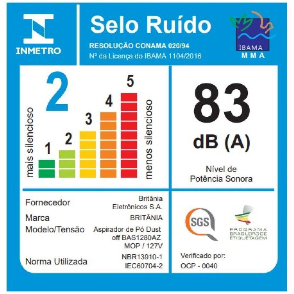 Aspirador de Pó Britânia Dust Off BAS1280AZ MOP 3 em 1 110VAo comprar este item, o consumidor está ciente e concorda que se trata de um produto de outlet, podendo apresentar pequenas avarias, tais como: desgaste tampográfico, riscos, marcas, manchas e/ou amassados, embalagem avariada ou reembalados/sem a caixa original, entretanto, com a sua funcionalidade em perfeito estado. A garantia do produto não cobrirá as avarias acima citadas. Oferta enquanto durar o estoque.Para qualquer momento você tem o Aspirador De Pó Britânia Dust Off BAS1280AZ MOP 3 em 1. Para uso vertical ou portátil ele tem potência de 1250W para te auxiliar na limpeza. Sem falar nos 5,5 metros de cabo para alcançar ao mais longe possível, sem precisar trocar de tomada. Seu filtro Hepa elimina até 99,5% das impurezas do ar. Além do seu design moderno, ele é super compacto, para guardar em qualquer cantinho. Podendo ser utilizado na vertical, como portátil e para passar pano.Principais Características:- Aspirador 3 em 1;- Design moderno e compacto;- Fácil de manusear e carregar;- Compartimento de pó com 1L;- Filtro HEPA permanente lavável;- Alcance de 5,5m;- Possui acessório MOP para uso em pisos secos ou levemente úmidos, com suporte. - Possui acessório para cantos e frestas;- Possui acessório com escova;- Possui acessório para sofá e almofadas;- Possui acessório para Pisos e Carpetes;- Pode ser usado sem a haste;- Acompanha suporte para acessórios;- Porta cordão;- Composição: Plástico e metal.Observação: Somente faturamos para o nosso consumidor final, ou seja, não faturamos pedidos para CNPJ por este portal de vendas.Especificações Técnicas:Marca: BritâniaModelo: BAS1280AZ Altura do produto: 111,5 cmLargura do produto: 28 cmComprimento do produto: 17 cmPeso do produto: 1,855 kgAltura com embalagem: 13,5 cmLargura com embalagem: 65,2 cmComprimento com embalagem: 16,5 cmPeso com embalagem: 2,15 kgGarantia: 90 dias