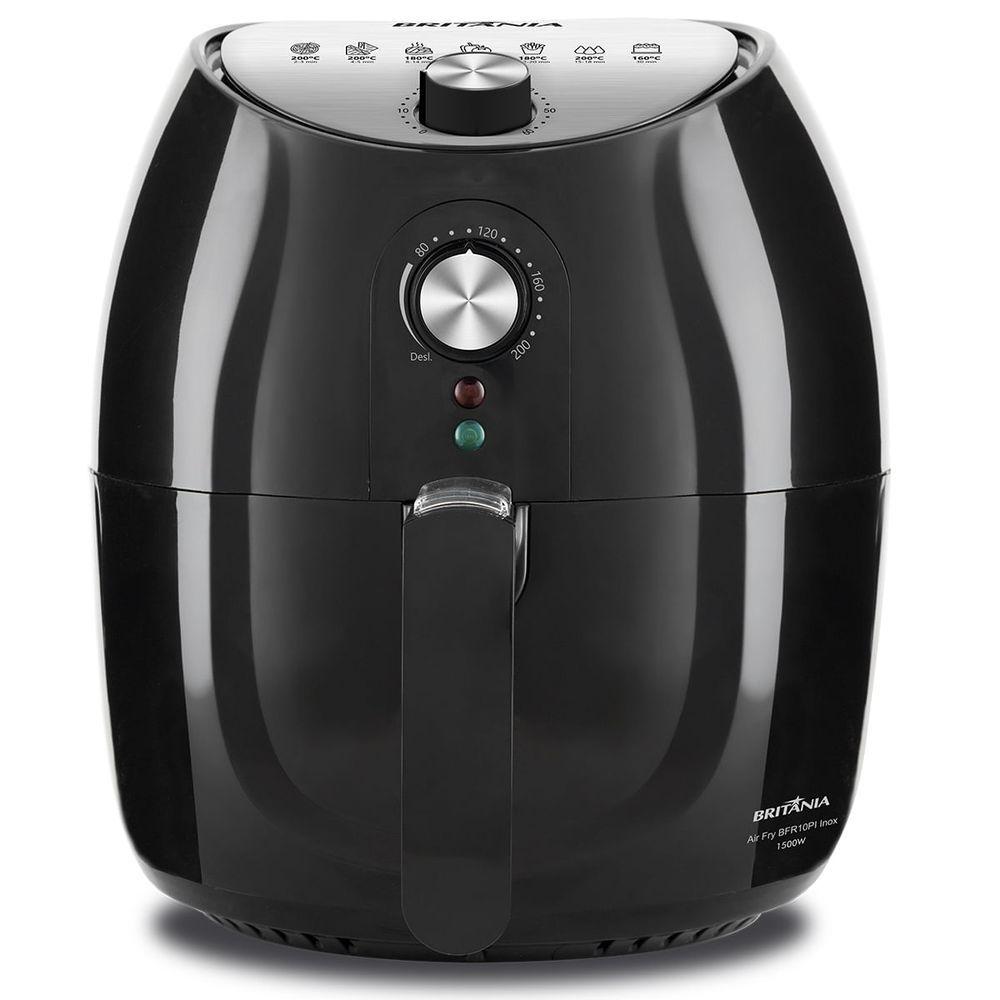 Air Fryer Britânia 4,1L 1500W Inox Sem Óleo BFR10PI 220VCom Design moderno e alta potência, a Air Fryer Britânia BFR10PI Inox 1500w vai te surpreender! Sem engordurar a cozinha, fritar diversos tipos de alimentos ficou mais fácil e saudável. Saborosos como fritos, mas sem usar óleo, os alimentos ficam macios por dentro e crocantes por fora. O cesto da Air fryer é removível, simples de usar e limpar, com capacidade de 4,1 litros. Possui timer de 60 minutos com desligamento automático. Possui proteção contra superaquecimento. Apresenta temperatura ajustável de 80° a 200°C. Cozinhar nunca foi tão fácil, você merece a melhor fritadeira, a Air Fryer Britânia BFR10PI Inox 1500w!Principais Características:- Frita com pouquíssimo ou nenhum óleo;- Seletor de temperatura com ajuste de 80 a 200°C;- Timer mecânico de 60 minutos com sinal sonoro;- Capacidade do cesto 3,5L e capacidade da cuba de 4,1 litros;- Luzes indicadoras de funcionamento e aquecimento;- Base antiderrapante;- Cesto metálico removível com revestimento antiaderente e trava de segurança;- Sistema de proteção contra sobreaquecimento;- Composição: Metal e Plástico;- Acabamento em aço inox.Observação: Somente faturamos para o nosso consumidor final, ou seja, não faturamos pedidos para CNPJ por este portal de vendas.Especificações Técnicas:Marca: BritâniaPotência (W): 1500 WFunção timer: SimModelo: BFR10PIEstado: NovoCor: PretoCesto antiaderente: SimCapacidade: 4,1 LControle de temperatura: 80°C a 200°CCesto removível: SimAltura do produto: 33,5 cmLargura do produto: 28,5 cmComprimento do produto: 34 cmPeso do produto: 4,088 kgAltura com embalagem: 35,5 cmLargura com embalagem: 32 cmComprimento com embalagem: 32 cmPeso com embalagem: 4,682 kgGarantia (Dias): 360