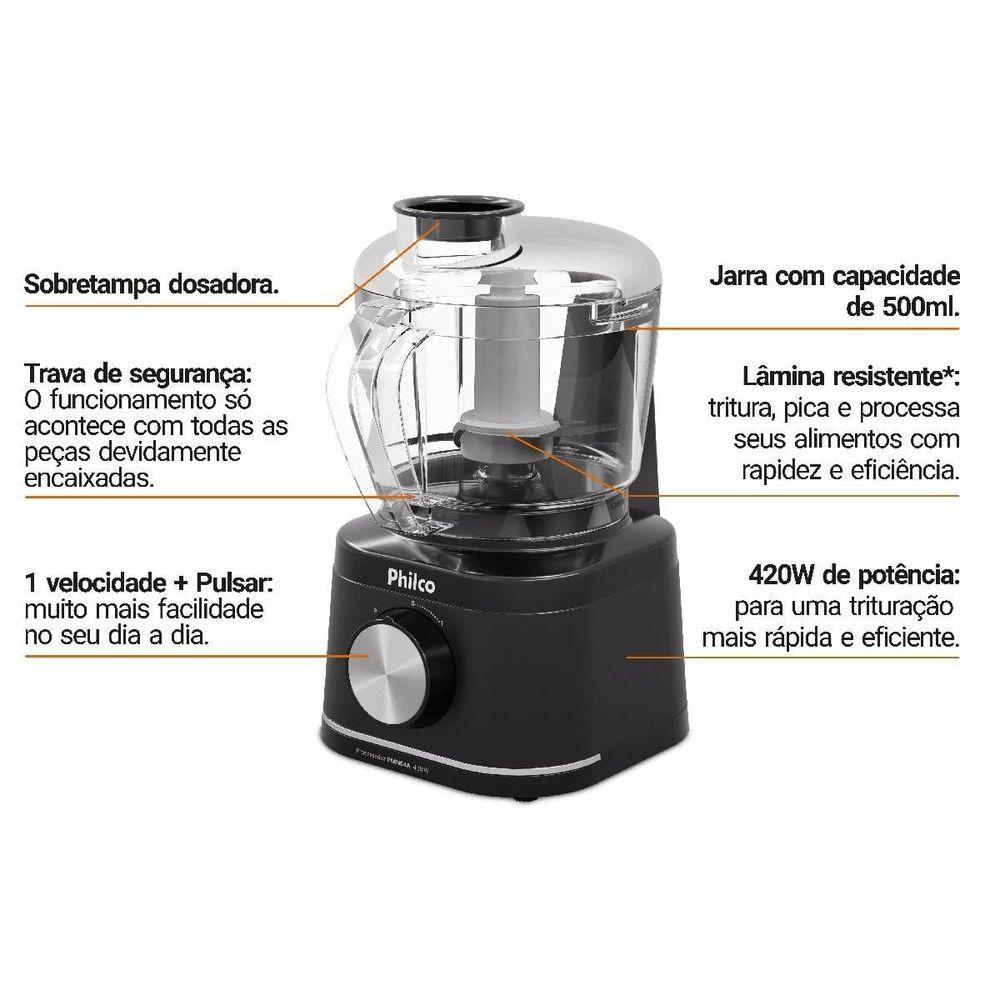 Processador Philco 420W Jarra Para 500ml PMN04A 110VImagine preparar molhos, cortar legumes ou amassar ingredientes em segundos, sem esforço. O Processador Philco 420W Jarra para 500ml chega para revolucionar sua rotina, unindo eficiência e segurança em um design que eleva o padrão da sua cozinha. Seja para quem busca agilidade, precisão ou praticidade, ele é o aliado que simplifica o preparo de refeições deliciosas.Com 420W de potência, você processa alimentos com a velocidade que sua rotina exige, nada melhor do que poder preparar sopas cremosas a vegetais picados em minutos. A jarra de 500ml é ideal para receitas individuais ou em pequenas porções. A trava de segurança garante que o aparelho só funcione quando montado corretamente, enquanto a sobre tampa dosadora permite adicionar ingredientes sem interromper o processo.Sua cozinha ganha robustez e estilo com o design premium do Processador Philco, feito para durar e harmonizar com qualquer ambiente. Não perca tempo com métodos tradicionais. O Processador Philco Jarra 500ml oferece a conveniência que você merece, com resultados profissionais ao alcance de um botão. Descubra como ele pode tornar suas refeições mais saborosas e sua rotina mais leve e garanta o seu!Principais Características:- Potência: 420W;- 1 velocidade + Pulsar;- Haste de plástico;- Capacidade copo / jarra: 500ml;- Suportes para armazenar o cordão;- 01 Faca para processar alimentos;- Com fio;- O copo pode ser levado à lava-louças;- Chave de segurança.Observação: Somente faturamos para o nosso consumidor final, ou seja, não faturamos pedidos para CNPJ por este portal de vendas.Especificações Técnicas:Marca: PhilcoModelo: Pmn04aAltura do produto: 23 cmLargura do produto: 20 cmComprimento do produto: 13,7 cmPeso do produto: 1,013 kgAltura com embalagem: 24,5 cmLargura com embalagem: 20,5 cmComprimento com embalagem: 14 cmPeso com embalagem: 1,15 kgGarantia: 12 meses