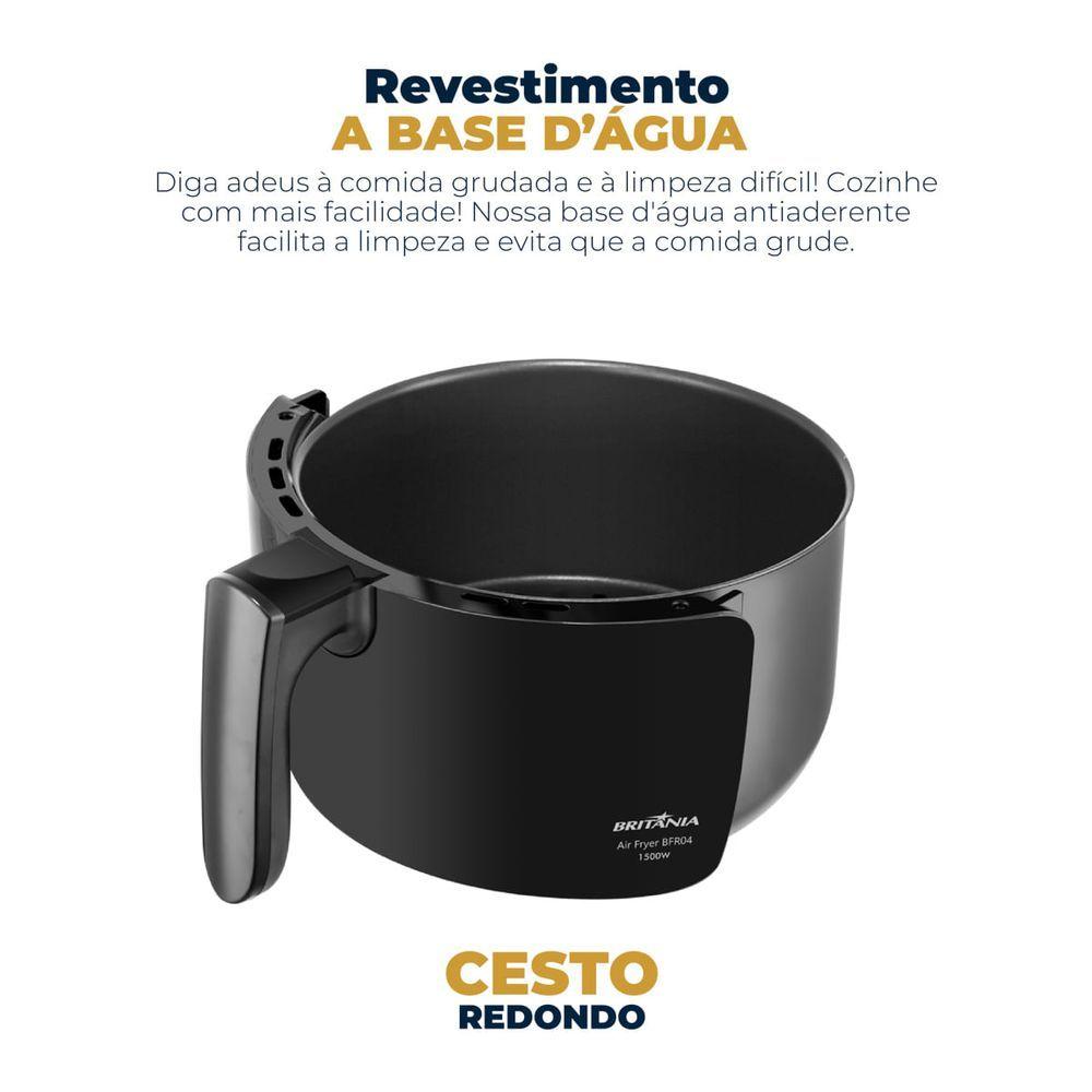 Air Fryer Britânia 3,8L Bella Cuccina Sem Óleo 1500W BCFR04 220VA Air Fryer Britânia Bella Cuccina BCFR04 é a escolha ideal para aqueles que buscam uma maneira eficiente e rápida de preparar alimentos deliciosos de forma saudável. Com sua potência de 1500W, ela aquece com eficiência e garante que seus pratos fiquem prontos em um piscar de olhos.Sua capacidade de 3,8 litros oferece espaço suficiente para preparar uma variedade de receitas, independentemente do tamanho. Isso significa que você pode criar desde porções individuais até refeições para toda a família sem nenhum problema.Outra característica da Air Fryer Bella Cuccina é o revestimento antiaderente de base d'água, mais resistente em comparação com os revestimentos convencionais, facilitando a limpeza e evitando que os alimentos grudem na superfície.Com o seletor de temperatura que varia de vai de 80 a 200° e o timer de 60 minutos, você tem o controle total sobre o processo de cozimento, podendo adaptar a configuração de acordo com o tipo de alimento que está preparando. A Fritadeira Air Fryer Bella Cuccina BCFR04 oferece uma maneira eficiente e saudável de preparar suas refeições favoritas. Principais Características:- Frita com pouquíssimo ou nenhum óleo;- Seletor de temperatura com ajuste de 80 a 200°C;- Timer de 60 minutos;- Capacidade da cuba de 3,8 litros;- Luz indicadora de funcionamento;- Luz indicadora de aquecimento;- Base antiderrapante;- Fundo removível com revestimento antiaderente;- Sistema de proteção contra sobreaquecimento;- Composição: Metal e Plástico.Observação: Somente faturamos para o nosso consumidor final, ou seja, não faturamos pedidos para CNPJ por este portal de vendas.Especificações Técnicas:Marca: BritâniaPotência (W): 1500 WFunção timer: SimModelo: BCFR04Estado: NovoTido de controle: AnalógicoCor: PretoCesto antiaderente: SimCapacidade: 3,8 LControle de temperatura: 80°C a 200°CCesto removível: SimAltura do produto: 31 cmLargura do produto: 29 cmComprimento do produto: 34,8 cmPeso do produto: 3,298 kgAltura com embalagem: 34,2 cmLargura com embalagem: 30,5 cmComprimento com embalagem: 30,5 cmPeso com embalagem: 3,768 kgGarantia (Dias): 360