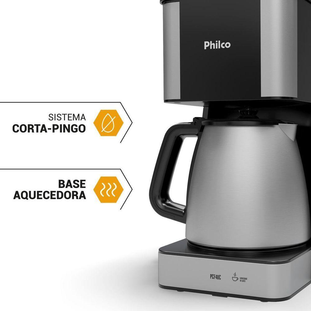 Cafeteira Philco PCF40C Inox 40 Cafezinhos 1,6L 950W 220VDesfrute do café perfeito a qualquer hora com nossa Cafeteira Philco PCF40C Inox que prepara até 40 cafezinhos. A jarra de alumínio com detalhes em inox, além de resistente, adiciona um charme especial e pode ser levada à mesa. Com capacidade de 1,6L, você pode fazer a quantidade de café ideal para suas necessidades. O filtro permanente e o porta-filtro removível dispensam o uso de filtros de papel e facilitam a limpeza. Já a placa de aquecimento mantém seu café na temperatura certa sem alterar o sabor, e o sistema corta pingo permite servir o café durante o preparo, sem desperdício. Aproveite um café fresco e delicioso a qualquer momento do dia com a Cafeteira Philco PCF40C Inox!Principais Características:- Capacidade para 40 cafés;- Capacidade do reservatório: 1,6L;- Reservatório de água com graduação;- Acompanha colher dosadora;- Detalhes em inox;- Jarra de alumínio;- Filtro permanente e porta filtro removível;- Placa de aquecimento, mantém o café aquecido após o preparo;- Sistema corta-pingos;- Botão luminoso liga/desliga.Observação: Somente faturamos para o nosso consumidor final, ou seja, não faturamos pedidos para CNPJ por este portal de vendas.Especificações Técnicas:Marca: PhilcoPotência (W): 950Modelo: PCF40CEstado: NovoConsumo (kW/h): 0,95Garantia (meses): 12Cor: PretoCapacidade (cafezinhos): 40Sistema corta-pingo: SimFunção Timer: NãoDisplay Digital: NãoPlaca de aquecimento: SimCapacidade do reservatório de água (L): 1,6Acompanha colher dosadora: SimFiltro permanente: SimJarra pode ser levada à mesa: SimAltura do produto: 33,5 cmLargura do produto: 19,5 cmComprimento do produto: 26 cmPeso do produto: 1,896 kgAltura com embalagem: 34,5 cmLargura com embalagem: 30 cmComprimento com embalagem: 20,5 cmPeso com embalagem: 2,264 kgGarantia: 360 dias