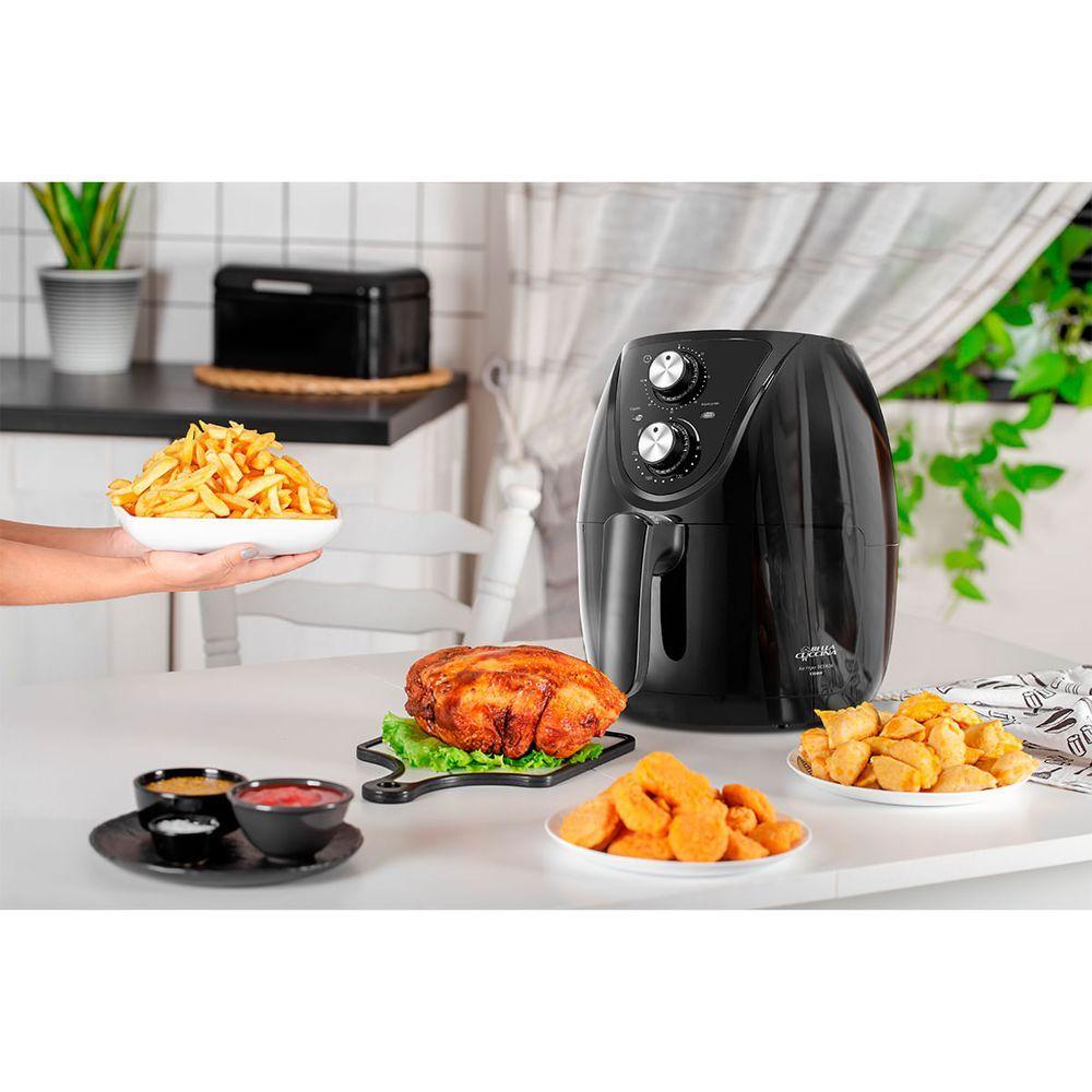 Air Fryer Britânia Bella Cuccina 3,8L BCFR06 220VPerfeita para quem está com fome, mas não quer ficar muito tempo na cozinha. Aproveite toda a praticidade que a Air Fryer Britânia Bella Cuccina 3,8L 1500W BCFR06 pode proporcionar para você no seu dia a dia! Removível e com revestimento antiaderente, o cesto da Air Fryer dura mais, traz maior resistência e praticidade, além de evitar que os alimentos grudem. Tudo isso, sem a necessidade do uso de óleo.De forma descomplicada e rápida, aliada a incrível potência de 1500W da Air Fryer Britânia Bella Cuccina BCFR06, prepare os mais variados alimentos, tendo o controle e alcance de temperaturas entre 80°C e 200 °C com apenas um acionamento.Desenvolvida com uma generosa capacidade de 3,8 litros, é a escolha ideal para preparar receitas maiores para amigos e toda a família! Simplifique sua vida na cozinha com a Air Fryer Britânia Bella Cuccina 3,8L 1500W BCFR06!Principais CaracterísticasFrita com pouquíssimo ou nenhum óleoSeletor de temperatura com ajuste de 80°C a 200°CTimer de 60 minutosCapacidade do cesto 3,5 litrosCapacidade da cuba de 3,8 litrosLuz indicadora de funcionamentoLuz indicadora de aquecimentoBase antiderrapanteCesto removívelCesto com revestimento antiaderenteSistema de proteção contra sobreaquecimentoComposição: Metal e Plástico.Observação: Somente faturamos para o nosso consumidor final, ou seja, não faturamos pedidos para CNPJ por este portal de vendas.Marca: BritâniaModelo: BCFR06Cor: PretoTipo: Sem óleoPotência: 1500 WFunção timer: SimEstado: Cesto antiaderente: SimCapacidade: 3,8 LControle de temperatura: 80°C a 200°CCesto removível: SimAltura do produto: 31 cmLargura do produto: 29,2 cmComprimento do produto: 35 cmPeso do produto: 3,5 kgAltura com embalagem: 34 cmLargura com embalagem: 30,5 cmComprimento com embalagem: 30,5 cmPeso com embalagem: 3,958 kgGarantia: 360 Dias