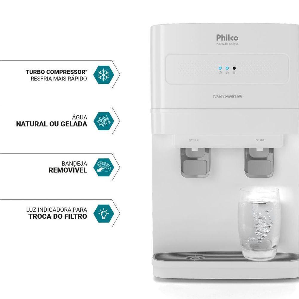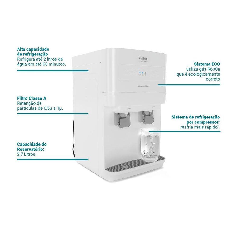 Purificador De água Philco Sistema Eco Ppu50a 220vDescubra como o Purificador de Água Philco Sistema ECO PPU50A transforma o cuidado com a sua família em um gesto simples e diário.A sensação de ter água sempre pura e fresca ao alcance das mãos torna sua rotina mais leve e segura. O sistema ECO, com gás R600a, valoriza escolhas sustentáveis, enquanto a refrigeração por compressor turbo oferece água gelada com rapidez para acompanhar seus momentos em família.O filtro de carvão ativado retém partículas, reduz o cloro e elimina odores e impurezas, garantindo água mais saudável.A alta capacidade de refrigeração entrega até 2 litros por hora, enquanto o filtro troca-fácil e o indicador de troca asseguram praticidade total.Duas torneiras resistentes permitem escolher água natural ou gelada, e o funcionamento silencioso preserva o conforto do ambiente.Valorize seu bem-estar|! Purificador de Água Philco PPU50A, traga conveniência, pureza e sustentabilidade para o seu dia a dia.Tipo de filtro: Carvão Ativado e Membrana UF que permite melhor filtragem e limpeza da águaClassicação do filtro: Classe ACapacidade de filtragem (Litros ou Tempo): 2000 litros ou 6 mesesTemperatura da água (Natural / Gelada): De 6°C a 10°C variando de acordo com a temperatura ambiente.Número de saídas de água: Uma para água natural e outra para água gelada.Dimensional do produto (AxLxP): A=490mm L=285mm P=336mmTipo de gás: R600aBandeja coletora removível : Removível e de fácil limpezaLuz indicadora de troca de filtro: Avisa o ciclo de vida do filtro garantindo maior qualidade de vida ao consumidor.Luz indicadora de funcionamento: Permite mostrar ao consumidor seu funcionamentoCapacidade de refrigeração L/h: 2 l/hCapacidade do reservatório interno: 800mlSubstâncias removidas (ex: cloro, bactérias, impurezas...): O sistema de filtro vise manter sua vida mais saudável com água livre de bactérias, odores, cloro e impurezasTipo de refrigeração: Compressor o que permite alta performance ao produtoTensão/Hz: 127V 60Hz / 220V 60HzSistema easy clean (fácil desmontagem para limpeza) Praticidade para seu dia a diaPotência: 130WPressão de operação:15 a 60 PSI (103 a 413 kPa).Acionamento - TorneiraGarantia (Dias) - 360Modelo - PPU50AEstado - NovoOBSERVACAO - Somente faturamos para o nosso consumidor final, ou seja, não faturamos pedidos para CNPJ por este portal de vendas;Água quente - NãoMarca - Philcoofficialstoreid_meli - 199meli_shipping_mode - me2Quantidade de torneiras - 2Com bandeja coletora de água removível - SimÁgua natural - SimÁgua gelada - SimComporta garrafão de até - Exemplo: 20 LCor - BrancoLugar de colocação - De bancadaTipo de alimentação - Energia ElétricaCertificação de teste externa - Não aplicávelUnidade Largura - CentímetrosUnidade Profundidade - CentímetrosUnidade Altura - Centímetros