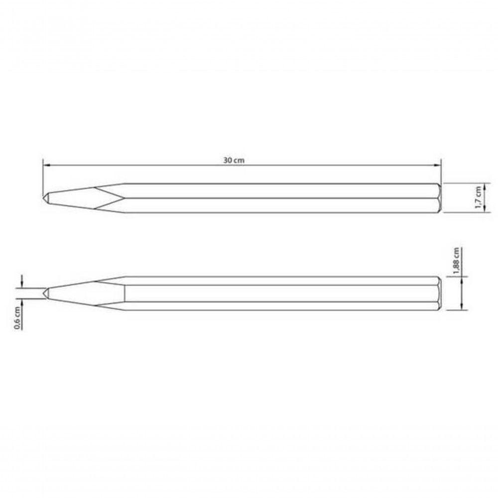 Ponteiro Sextavado 12" Tramontina Master Com EmpunhaduraInvestir continuamente na atualização tecnológica dos meios de produção, na expansão das áreas industriais e no conhecimento é prioridade na Tramontina.Recomendações de Uso:- Sempre utilizar óculos de para proteger os olhos.- utilizar luvas para proteger as mãos.- utilizar talhadeiras e ponteiros em superfícies ou componentes de dureza inferior a suas arestas de corte ou pontas.- Descartar qualquer talhadeira ou ponteiro que apresente rachaduras, sinais de uso excessivo ou que tenham a face de impacto deformada.- golpear as talhadeiras e ponteiros perpendicularmente às faces de impacto.- Foto meramente ilustrativa.Informações Adicionais:- Estas ferramentas de impacto tem dureza diferenciada no gume de corte ou ponta e na face de impacto que será golpeada.- as ferramentas são submetidas a testes de aplicação prática para garantir sua resistência mecânica em uso intenso.- a pintura eletrostática ou camada de fosfato mais deposição de óleo aplicado Na superfície das peças garantem uma proteção Excelente contra a corrosão.- Corpo em aço especial.- Acabamento fosfatizado.- Têmpera por indução nas duas extremidades.- Barra sextavada.- as ferramentas são produzidas e testadas conforme normas específicas.