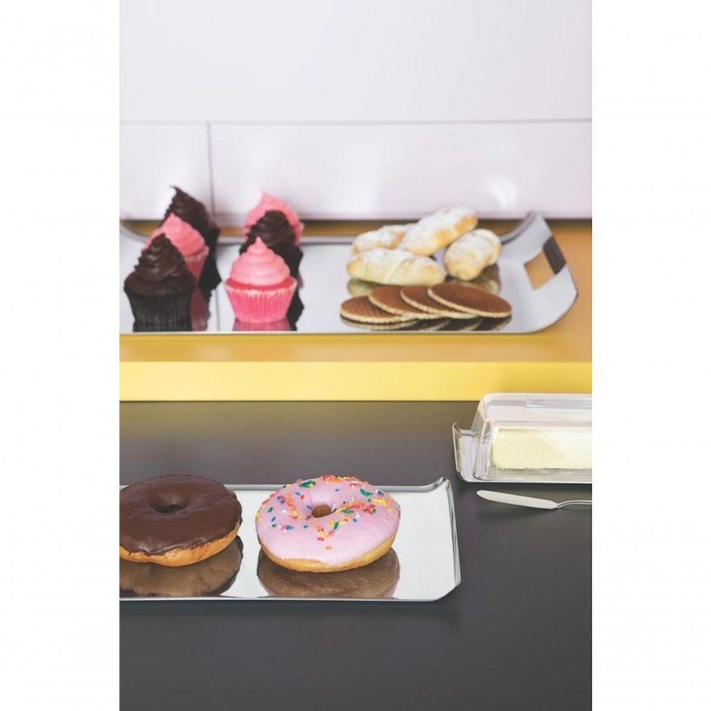 Bandeja Retangular Tramontina Quadrata Em Aço Inox 38x17cmTraços simples e elegantes traduzem a linha Quadrata da Tramontina. Com os produtos ideais para compor a mesa do café, do almoço oudo jantar, o inclui prato de aço inox com cúpula de acrílico, porta-frios, açucareiro de acrílico com tampa e colher de aço inox e jarra de acrílico com tampa de aço inox.Recomendações de Uso:Antes do uso: Antes de utilizar o , remova as eventuais etiquetas e lave-o com água quente e de uso Use apenas sabão ou detergente e uma esponja macia. Outros tipos de produto como palha de aço, poderão riscar ou prejudicar o brilho da peça. Enxágue cada item a fim de remover totalmente os resíduos dos produtos de limpeza, que, por serem abrasivos, podem danificar o inox. Sempre que possível, use água quente, pois renova o brilho da peça. Após a lavagem, enxugue imediatamente a peça, caso contrário, as substâncias químicas da água (cloro) poderão causar manchas. Evite atrito entre as peças durante o processo de lavagem e no armazenamento, para mantê-la sem riscos. Evite o do produto com superfícies quentes, pois elas provocam a descoloração do material. Não guarde a peça em locais úmidos. A umidade também provoca manchas.- Foto meramente ilustrativa.- Embalagem litografada.Informações Adicionais:- Totalmente feita de aço inox, altamente durável, mantém suas características , preservando a beleza, a higiene e a durabilidade do material. - Design moderno e prático. Ideal para servir. - Acabamento em alto brilho. - Pode ser lavada diariamente na máquina de lavar louças.