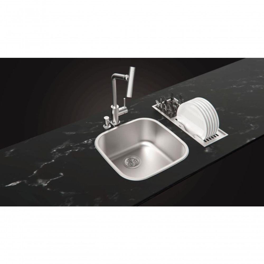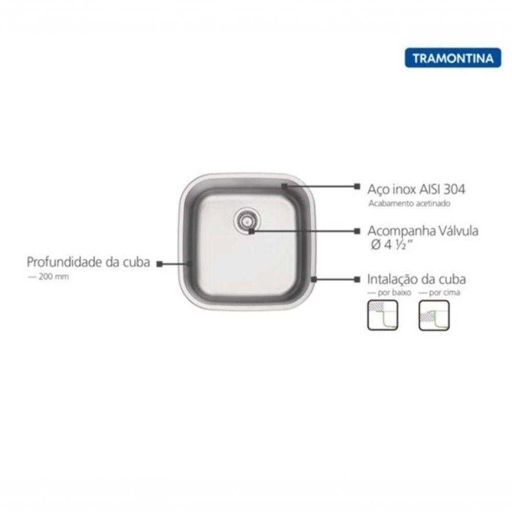 Cuba De Embutir/sobrepor Tramontina Aria Maxi 40 Bs Em Aço Inox Acabamento Escovado 40x40 CmA Cuba de Embutir ou Sobrepor Aço Inox 40x40 cm Acetinada Tramontina Aria Maxi é a escolha perfeita para levar funcionalidade e beleza para sua cozinha! Produzida em aço inox com acabamento acetinado, pode ser instalada de maneira embutida ou sobreposta na bancada, pois a cuba já possui borda para ambas as instalações. Ela possui espessura de 0,8 milímetros e 20 centímetros de profundidade, características que garantem alta resistência, durabilidade e praticidade na hora de executar suas tarefas.Recomendações de Uso:Antes do Uso: Remover a etiqueta colada na cuba. Limpar a pia com detergente neutro. Usar somente esponja macia ou pano para de Uso: Não usar ácido muriático, água sanitária ou qualquer outro solvente para lavar objetos. Na reforma ou construção, proteger a pia para não deixar sobre a mesmo pó de cimento ou gesso. Enxaguar e secar bem a peça após o uso. Nunca deixar objetos metálicos sobre a peça por períodos muito longos, para evitar a corrosão. Para manter o brilho, recomenda-se o uso da pasta para polir e remover manchas em superfícies de aço inoxidável Tramontina (94537000). Esta peça contém bordas cortantes, manusear com cuidado.Informações Adicionais:- Adesivo antirruído;- com triturador: - Capacidade: 28 litros;- Furo para torneira: Não;- Instalação: Embutir ou sobrepor;- Dimensões da cuba (C x L): 40x40 cm;- Válvula descentralizada que permite melhor aproveitamento da cuba.- Foto meramente ilustrativa.