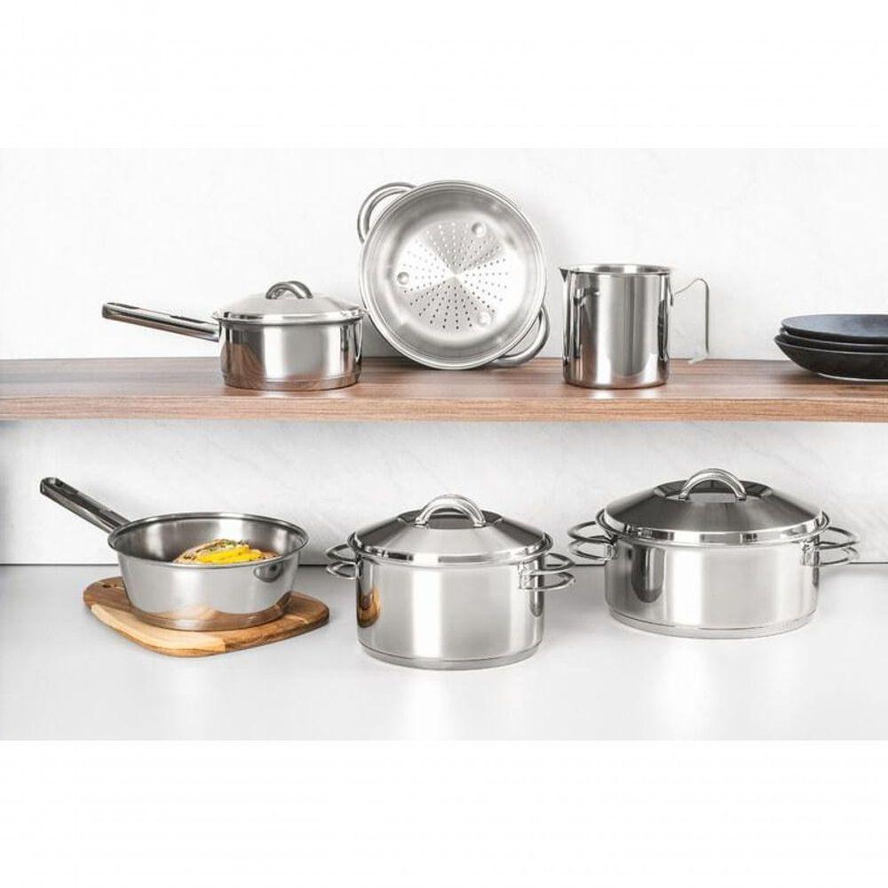 Jogo De Panelas Tramontina Solar Com Fervedor Em Inox 6 PeçasLindas e estilosas, o Jogo de Panelas Tramontina Solar em Aço Inox com Fundo Triplo e Tampas de Inox 6 Peças é um clássico Tramontina. Práticas e duráveis, as seis peças são produzidas totalmente em aço inox, que mantém os alimentos saudáveis já que o material não solta resíduos. Possuem fundo triplo (aço inox + alumínio + aço inox), característica que distribui o calor de forma uniforme, proporcionando um cozimento mais rápido e deixando os alimentos aquecidos por mais tempo, além de economizar mais energia. São peças versáteis que podem ir ao forno para gratinar ou finalizar pratos na temperatura máxima de 260°C e ser utilizadas em diferentes tipos de fogões. Possuem tampa com encaixe perfeito e saída de vapor. O acabamento em alto brilho faz delas as melhores escolhas para uma cozinha mais bonita. São fáceis de limpar devido ao desenho sem cantos, além de poderem ir à máquina de lavar louças diariamente. A escolha perfeita para ter uma cozinha muito mais completa!Recomendações de Uso:Antes do uso: Antes de utilizar o , remova as eventuais etiquetas e lave-o com água quente e detergente.Modo de uso: Use uma fonte de calor brando para evitar que o alimento grude no fundo da caçarola, não sendo necessário o fogo alto. Quando a caçarola for utilizada no fogão a gás, a chama não deve ultrapassar a base da caç caso de uso de chapa elétrica, a chapa deverá ter diâmetro igual ou inferior ao da caçarola. Sempre dissolva o sal em água fervendo ou com os alimentos, mexendo os ingredientes no início do cozimento. Não aqueça o alimento colocando uma caçarola do mesmo diâmetro sobre a outra. Esse procedimento é perigoso, pois cria vácuo e impossibilita a retirada do mesmo. Alguns alimentos que possuem amido, como massa e arroz, poderão deixar manchas na parte interna da caçarola durante o cozimento. Para remover facilmente as manchas, passe um pano umedecido com suco de limão ou vinagre, ou utilize a pasta para polir e remover manchas Tramontina (94537000). Depois da lavagem, sempre que possível, enxágue a caçarola com água quente e seque-a imediatamente, pois o cloro e as substâncias contidas na água podem deixar manchas na caçarola. Não deixe a caçarola vazia sobre uma fonte de calor. Deixe as caçarolas quentes somente em superfícies resistentes ao calor. Os cabos de inox aquecem durante o cozimento, por isso use luvas durante o ácil de limpar: deixar sua panela brilhando é simples, você só precisa de água, sabão e uma esponja macia. Se preferir, é só colocar na máquina de lavar.- Foto meramente ilustrativa.Informações Adicionais:- Tampa(s) com saída de de vapor;- ; Fundo triplo (aço inox + alumínio + aço inox);- Capacidade volumétrica máxima para cozimento é de 3/4 da capacidade total da peça;- 01 Cozi Vapore 62510200: Ø 20 cm - 3,2 Litros; ;- 01 Caçarola Funda 62504200: Ø 20 cm - 3,60 Litros - Espessura: 0,7 mm;- 01 Caçarola com Cabo 62501160: Ø 16 cm - 1,4 Litros - Espessura: 0,7 mm;- 01 Caçarola Rasa com Alças 62503240: Ø 24 cm - 4,7 Litros - Espessura: 0,7 mm;- 01 Frigideira Allegra sem Tampa 62650200: Ø 20 cm - 2,20 Litros - Espessura: 0,5 mm;- 01 Fervedor Allegra sem tampa 62664120: Ø 12 cm - 1,40 Litros (não possui fundo triplo).