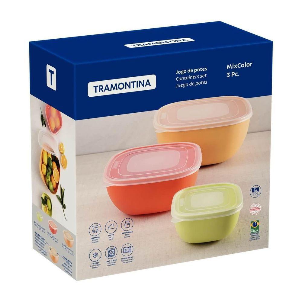 Jogo De Potes Tramontina Mixcolor 3 Peças ColoridoChega daqueles potes com tampas perdidas e que só ocupam espaço em sua cozinha. Busque itens funcionais e que garantam praticidade para o seu dia a dia, como o jogo de potes Tramontina Mixcolor em polipropileno colorido com tampa transparente 03 peças. Desenvolvidas com alta resistência e durabilidade, as peças são livres de Bisfenol-A e contam com proteção antimicrobiana, que inibe o crescimento de fungos e bactérias. Com os potes Mixcolor, você conserva os alimentos da melhor maneira e facilita suas tarefas, pois podem ir ao micro-ondas, refrigerador e freezer, além da máquina de lavar louças. Escolha Tramontina e faça bonito na sua cozinha!Recomendações de Uso:Antes do Uso: Lave bem as peças e seque-as.Modo de Uso: Para limpeza, use somente esponja macia e detergente neutro. Não utilize materiais abrasivos. Com o uso, é normal que apareçam riscos no interior dos potes. Enquanto estiver congelado, evite impactos. Não coloque o pote em direto com superfícies quentes. Ao levar ao micro-ondas, deixe a tampa do pote entreaberta. Recomenda-se mexer o alimento durante o aquecimento no micro-ondas. Nunca utilize a função grill do micro-ondas. Evite aquecer alimentos como chocolates, caramelos, açúcar, e alimentos gordurosos, pois podem atingir altas temperaturas e danificar seu pote. Não utilize o pote para fazer pipocas no microondas pois irá danificá-lo. Molhos com forte pigmentação, como de tomate, açafrão e curry podem manchar o interior das peças. Guarde os potes separados das tampas para evitar odores. Para descarte dos produtos e embalagem siga as orientações de reciclagem vigentes.- Foto meramente ilustrativa.Informações Adicionais:- Potes e tampas de polipropileno;- Tampas transparente que facilitam o dia a dia;- Podem ser levados à máquina de lavar, micro-ondas, refrigerador e freezer, facitando o dia a dia;- Potes com proteção antimicrobiana que inibem o crescimento de fungos e bactérias, proporcionando benefícios em higiene e redução de microorganismos que causam contaminação;- Produtos Livre de BPA: O Bisfenol-A é um componente químico na produção de alguns plásticos como o Policarbonato. Este componente pode ser prejudicial à saúde e por isso a Tramontina não o utiliza em seus produtos.