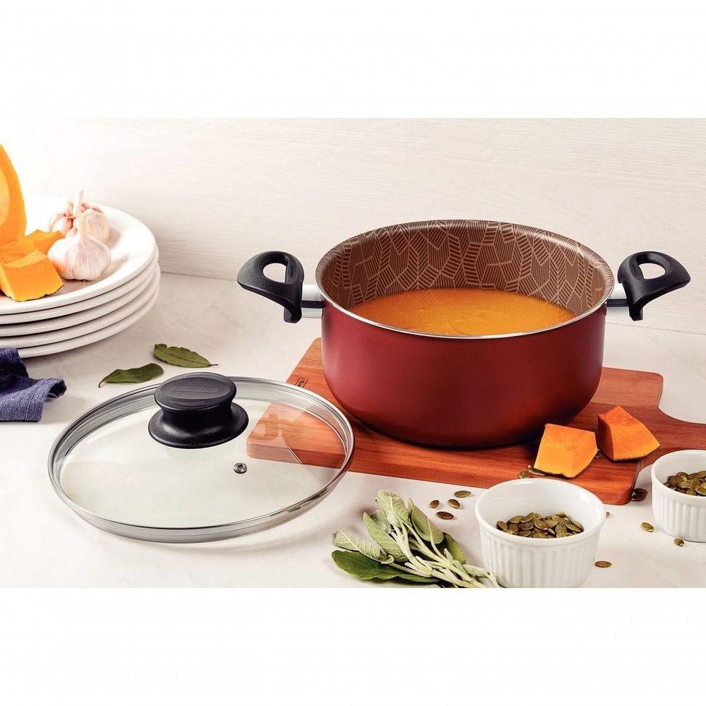 Caçarola Tramontina Paris 20cm Em Alumínio Com Revestimento Antiaderente Com Tampa De Vidro VermelhaA caçarola Tramontina Paris em alumínio com revestimento interno e externo em antiaderente Starflon Max vermelho com tampa de vidro 20 centímetros 2,9 litros vai ser sua ajudante principal durante o preparo das refeições. É produzida em alumínio com espessura de 1,8 milímetros e revestimento interno e externo de antiaderente Starflon Max. Devido a essas características, ela proporciona um cozimento rápido e uniforme dos alimentos, evita que eles grudem em sua superfície e é superfácil de limpar. Suas alças são em baquelite e o pegador da sua tampa de vidro em nylon, dois materiais antitérmicos que não aquecem e oferecem maior e conforto ao manuseio. Ela ainda pode ser levada à máquina de lavar louças e vai otimizar seu tempo na cozinha!Recomendações de Uso:Antes do Uso: Lave com esponja macia, sabão neutro ou detergente líquido. Depois de secar, unte a área interna com óleo ou gordura e leve ao fogo por um ou dois minutos. Deixe esfriar e lave novamente. Seu utensílio Starflon está pronto para uso com ou sem gordura, sempre em fogo baixo ou médio (nunca superior a 260 °C). Para mexer os alimentos use somente utensílios de silicone, nylon ou madeira. Com o uso, as alças e o pegador podem afrouxar devido à dilatação normal dos materiais. Reaperte apenas o suficiente, sem forçar. Limpeza: Evite a imersão do utensílio quente em água fria. Nunca utilize produtos abrasivos na lavagem. Se deixar queimar alimentos, umedeça a área e reserve até que possa remover os resíduos grudados com esponja e sabão. Para descarte do produto e embalagem siga as orientações de reciclagem vigentes.- Foto meramente ilustrativa.Informações Adicionais:- Pode ir à máquina de lavar louças facilitando seu dia a dia;- Tampa de vidro temperado, com saída de vapor e borda de aço inox;- Revestimento interno e externo de antiaderente Starflon Max livre de PFOA;- A capacidade volumétrica máxima para cozimento é de 3/4 da capacidade total da peça;- Alças de baquelite antitérmico e pegador de nylon que oferecem durante o manuseio. ;