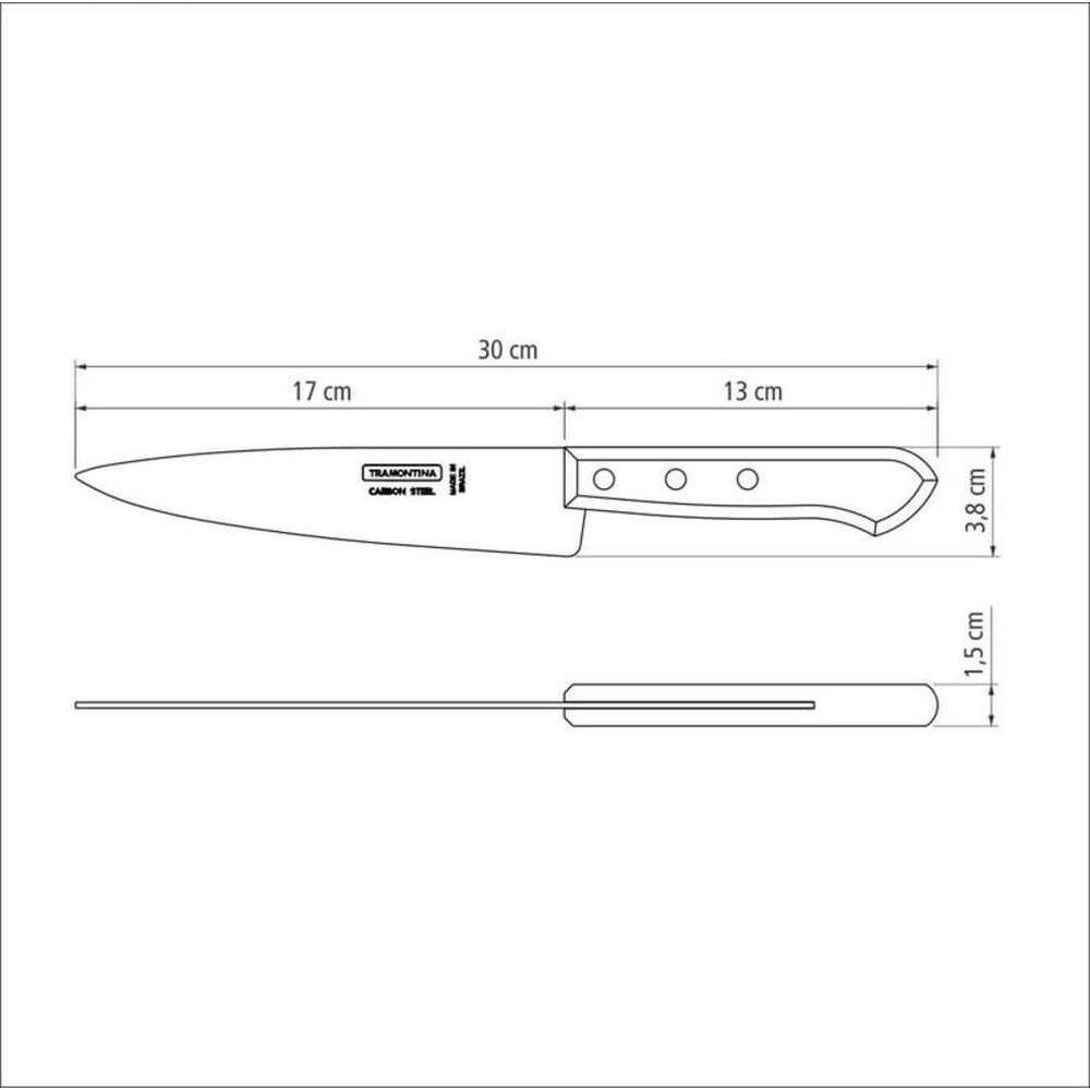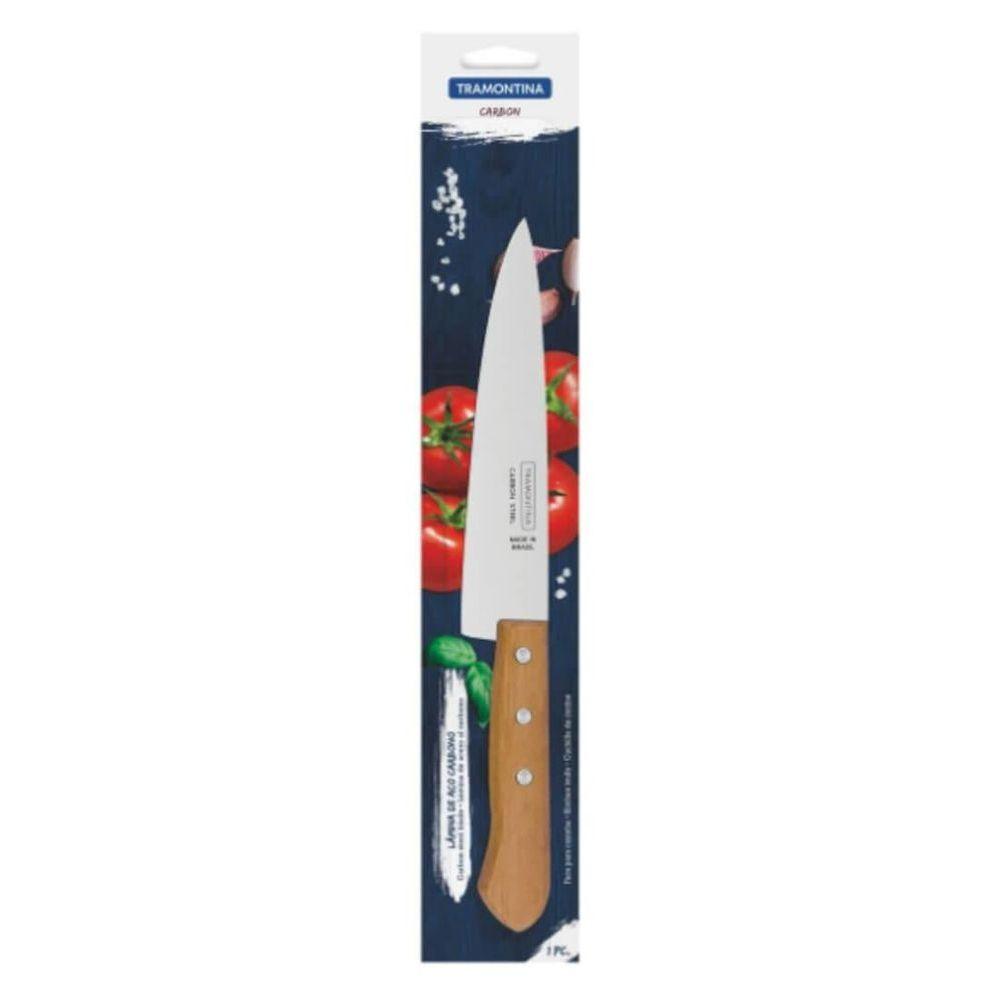 Faca Peixeira Tramontina 7 Lâmina De Aço Carbono E Cabo Em MadeiraFacas para quem exige desempenho e praticidade na cozinha. Produzidasem aço de excelente qualidade, são especiais para cortar peixes,mandioca, carnes, frios e os mais variados cabos demadeira, possuem empunhadura firme e de fácil âminas de açocarbono.Recomendações de Uso:Antes do uso: Antes de utilizar o , remova as eventuais etiquetas e lave-o com água e de uso:Durante a lavagem use somente esponja macia, outros tipos de produtos, como palha de aço, poderão riscar ou prejudicar o brilho do aço inox. Enxágue bem a peça a fim de remover totalmente os resíduos dos produtos de limpeza, que por serem abrasivos, podem danificar o inox. Após a lavagem enxugue a peça, pois as substâncias químicas contidas na água poderão causar manchas. Sempre que possível use água quente, pois renova o brilho do talher. Evite o das peças com superfícies quentes, pois podem provocar a descoloração do produto. Quando usar a máquina de lavar louça, recomendamos retirar o talher logo que tenha terminado o ciclo enxaguar, a fim de que os mesmos sejam secados manualmente.- Tenha cuidado ao Manusear produtos cortantes e perfurantes e mantenha-os fora do alcance de criançções de uso: As facas com lâmina de aço carbono se caracterizam por uma maior resistêcia do fio, o que lhe confere bom poder de corte e são facilmente afiadas. Entretanto essa propriedade do aço carbono dá uma propensão maior à oxidação e descoloração do aço, se não forem tomados alguns cuidados básicos como: - Sua faca é uma ferramrnta de corte, não utilize para fins indequados. - Procure mantê-la sempre afiada. - Evite procedimentos que possam danificar o fio. Recomenda-se operações de corte sobre uma prancha de madeira ou plático, que além de proteger as superfícies de sua cozinha, retardam o desgaste do fio da faca. - Lave-a após cada utilização com água morna e seque-a imediatamente, evitando assim que a faca seque naturalmente, pois a umidade é a maior inimiga de sua faca carbono.- Ao guardar sua faca proteja a lâmina com algum óleo protetivo, o que reduzirá a possibidade de oxidação. O azeite comestível é uma das alternativas.- Foto meramente ilustrativa.Informações Adicionais:- Cabo de madeira, rústico e natural. Fixado por rebites de alumínio.- Lâmina com maior resistêcia no fio, o que lhe confere bom poder de corte e são facilmente afiadas.- a Lâmina recebe uma proteção de verniz que lhe Proporciona uma Maior resistêcia a corrosão.