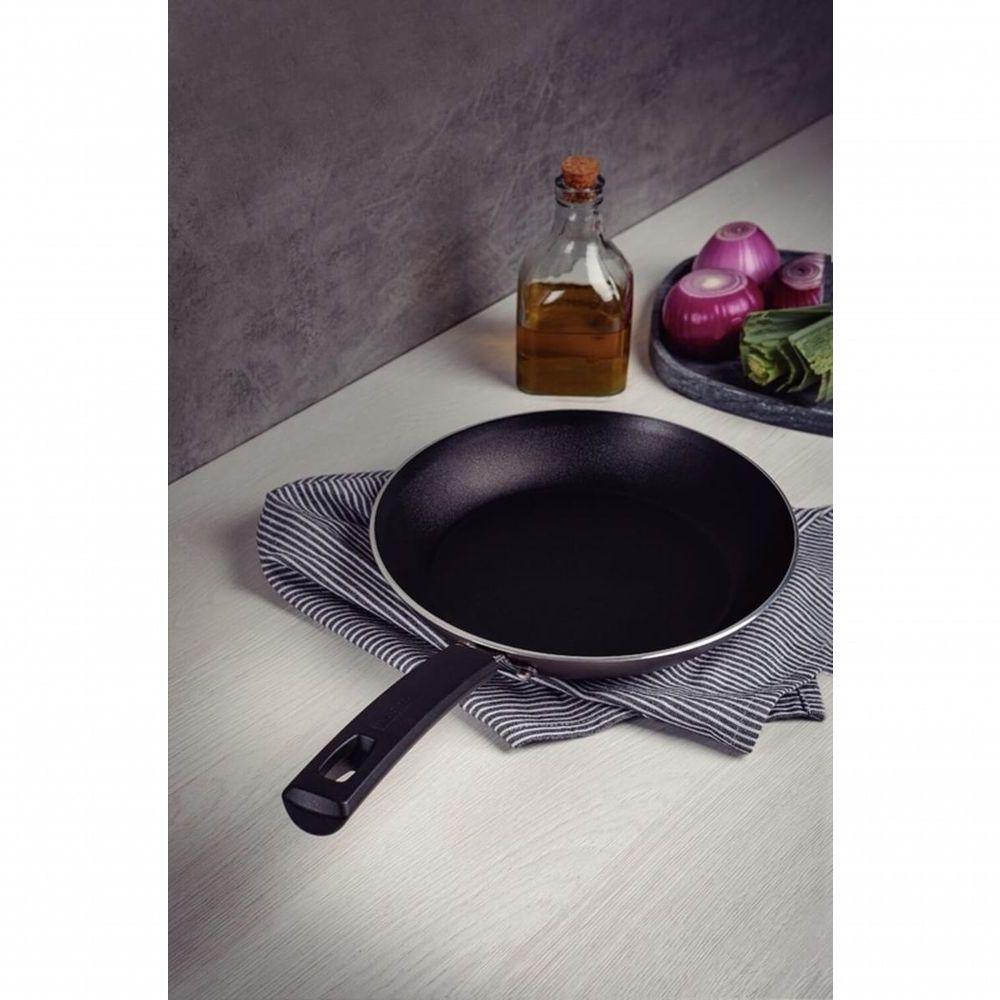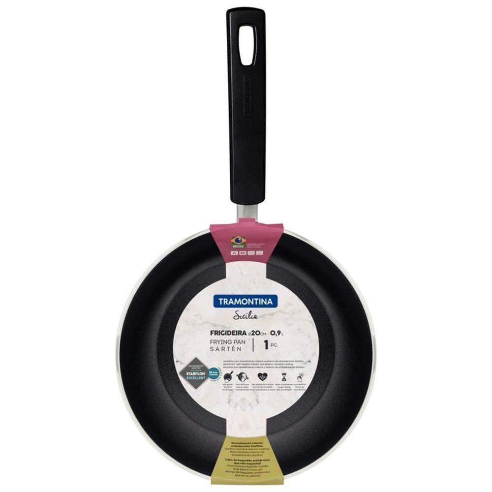 Frigideira Tramontina Sicília Antiaderente Avelã 20cm A frigideira Tramontina Sicília em alumínio com revestimento interno e externo em Starflon Excellent avelã 20 centímetros de diâmetro 0,95 litros é o utensílio perfeito para preparar aquela batata suíça cremosa e deliciosa! Ela é produzida em alumínio com revestimento interno e externo Starflon Excellent, proporciona o cozimento uniforme dos alimentos e evita que eles grudem em sua superfície. Seu cabo é em baquelite antitérmico, não aquece e garante um manuseio e confortável na hora de preparar suas refeições, deixando-lhe muito mais tranquilo. Ela ainda é superfácil de limpar e pode ir à máquina de lavar louças, otimizando sua rotina na cozinha. Com a Tramontina, você garante o melhor para sua cozinha e refeições muito mais deliciosas à sua mesa!Recomendações de Uso:Antes do Uso: Lave com esponja macia, sabão neutro ou detergente líquido. Depois de secar, unte a área interna com óleo ou gordura e leve ao fogo por um ou dois minutos. Deixe esfriar e lave novamente. Seu utensílio Starflon está pronto para uso com ou sem gordura, sempre em fogo baixo ou médio (nunca superior a 260ºC). Para mexer os alimentos use somente utensílios de silicone, nylon ou madeira. Limpeza: Evite a imersão do utensílio quente em água fria. Nunca utilize produtos abrasivos na lavagem. Se deixar queimar alimentos, umedeça a área e reserve até que possa remover os resíduos grudados com esponja e sabão. Para descarte do produto e embalagem siga as orientações de reciclagem vigentes. Este produto não necessita de manutenção, apenas limpeza.- Foto meramente ilustrativa.Informações Adicionais:- Pode ir à máquina de lavar louças facilitando seu dia a dia;- Cabo de baquelite antitérmico que oferece durante o manuseio;- Corpo de alumínio com espessura de 3,0 mm que proporciona cozimento rápido e uniforme;- Revestimento interno e externo de antiaderente Starflon Excellent que não gruda, é fácil de limpar, mais durável, não é prejudicial a saúde e é livre de PFOA.