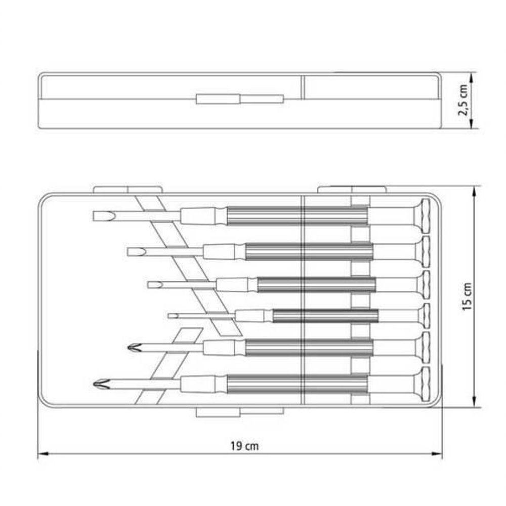 Jogo Chaves De Precisão Tramontina 6 PeçasCom o Jogo de Chaves de Precisão Tramontina 6 Peças, você tem à disposição as ferramentas ideais para pequenos reparos e ajustes delicados. O conjunto conta com 4 chaves de fenda com ponta chata e 2 com ponta cruzada (Phillips), ideais para trabalhos que exigem precisão, como manutenção de eletrônicos, brinquedos, óculos e outros objetos pequenos. Leves, práticas e fáceis de manusear, essas chaves garantem mais agilidade e eficiência nas suas tarefas do dia a dia. Uma solução prática para ter sempre à mão.Recomendações de Uso:Modo de uso: use óculos, luvas e outros equipamentos de proteção de acordo com a tarefa a ser executada. Utilize chaves de fenda isoladas, identificadas pela marcação , quando for necessário trabalhar em locais com corrente elétrica. Importante: nestes casos, inspecione a integridade da isolação elétrica, e, se aparecerem trincas na isolação, suspenda o uso imediatamente. Utilize chaves com ponta adequada para cada tipo de fenda, para realizar a tarefa de forma mais rápida e segura. Não utilize as chaves de fenda como formão ou alavanca. Não altere as dimensões da ponta para obter outro perfil. Armazene em limpo e seco.- Foto meramente ilustrativa.Informações Adicionais:- Acabamento fosfatizado;- Haste em aço cromo vanádio;- Cabos injetados com material de alta resistência;- Acompanha estojo plástico para guardar as chaves;- Possui cabeça giratória para facilitar o manuseio com apenas uma das mãos;- Os dimensionais das pontas são verificados com gabaritos-padrão, calibrados e certificados;- As hastes das chaves de fenda são testadas em máquinas de ensaio específicas, para verificar o perfeito balanço entre resistência mecânica e dureza.