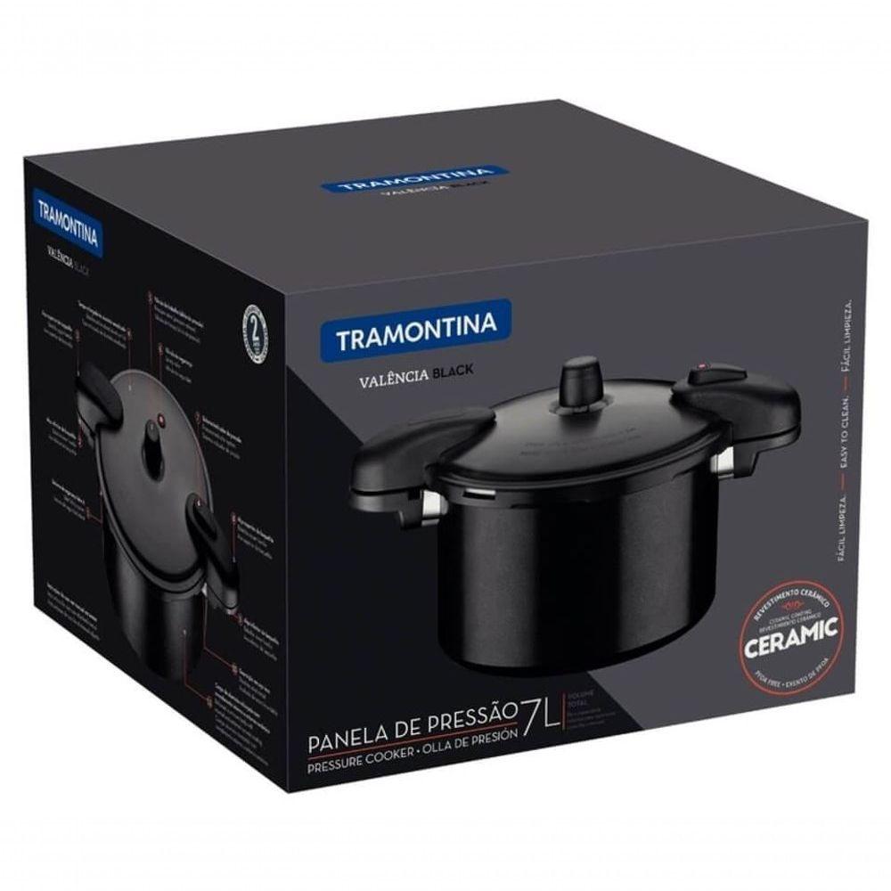 Panela De Pressão Tramontina Valência Black Cerâmica 24cm 7lGrão de bico, lentilha e o feijão que não pode faltar no seu dia a dia... todos ficam ainda mais saborosos quando preparados na panela de pressão Tramontina Valência Black. Com 24 centímetros de diâmetro e capacidade para 7 litros, esta panela foi desenvolvida para proporcionar praticidade e na sua rotina na cozinha. Seu corpo em alumínio possui espessura especial e revestimento cerâmico interno e externo. Os pegadores em baquelite antitérmico reduzem a propagação do calor, garantindo durante o manuseio. Esta panela é a escolha ideal para cozinhar alimentos de maneira rápida, uniforme e funcional!Recomendações de Uso:Modo de Uso: Ao utilizar utensilios quentes tenha cuidado redobrado. Se necessário, utilize proteção para as mãos e mantenha fora do alcance de crianças. Para sua , ao utilizar utensílios com cabos, mantenha os mesmos sempre voltados para o centro do fogão. Ao utilizar seu utensílio em fogões com grade, mantenha a peça centralizada e alinhe o cabo com a grade, para reduzir o risco de queda. Para descarte do produto e embalagem siga as orientações de reciclagem vigentes.- Foto meramente ilustrativa.Informações Adicionais:- Não recomendamos o uso em lava-louças;- Panela com acabamento interno satinado e externo polido;- Tampa de alumínio com acabamento externo polido e interno satinado;- Panela com revestimento interno e externo cerâmico que facilita a limpeza;- Alças de baquelite antitérmico que oferecem durante o manuseio.
