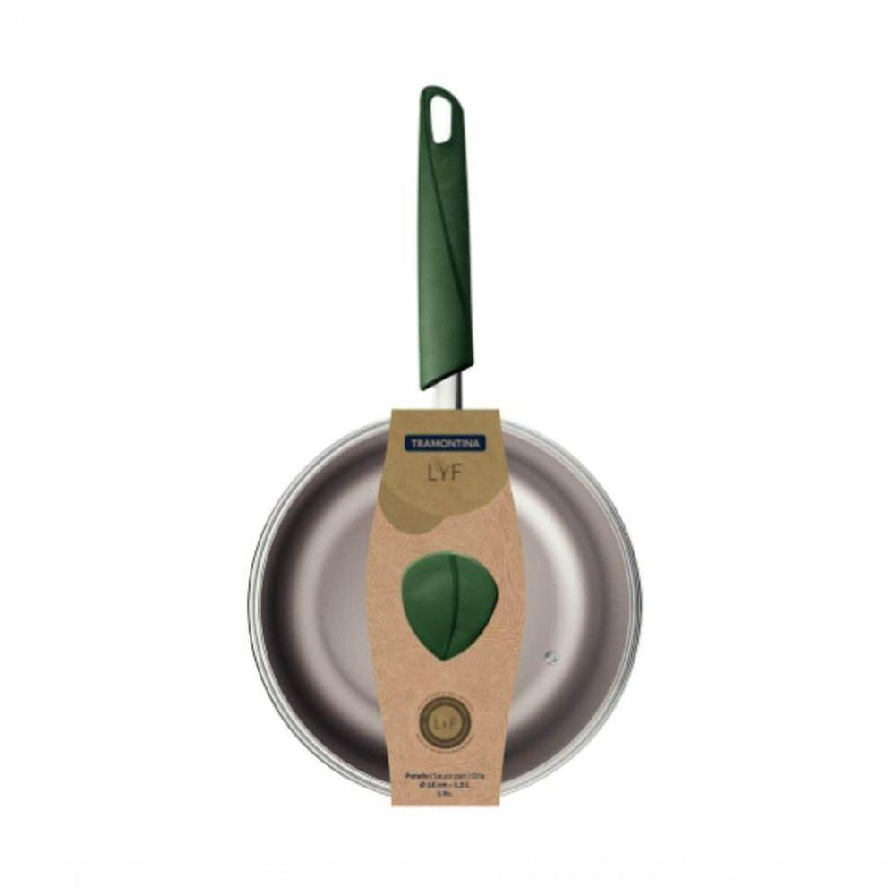 Panela Tramontina Lyf 16cm Em Alumínio E Revestimento Antiaderente Verde NaturezaA panela Tramontina LYF em alumínio com revestimento interno e externo em antiaderente Starflon Max verde natureza 16 centímetros de diâmetro 1,5 litros é desenvolvida para quem deseja ter uma cozinha mais sustentável. Com corpo de alumínio com espessura de 1,8 milímetros que proporciona cozimento rápido e uniforme e revestimento interno e externo de antiaderente Starflon Max que não gruda, ela é ideal para lhe acompanhar nos preparos das suas refeições diárias. Sua tampa é em vidro com saída de vapor e borda de aço inox e seu cabo é em termoplástico de engenharia de alta resistência e 100% reciclável, que oferece durante o manuseio, assim como seu pegador de nylon. Tramontina LYF: a escolha mais sustentável para sua cozinha!Recomendações de Uso:Atenção! Cabo: Por ser um material 100% reciclável, não podem estar em direto com a chama. Por isso, utilize apenas em fogo baixo ou médio e mantenha o utensílio centralizado sobre a chama do fogão.Antes do Uso: Lave com esponja macia, sabão neutro ou detergente líquido. Depois de secar, unte a área interna com óleo ou gordura e leve ao fogo por um ou dois minutos. Deixe esfriar e lave novamente. Seus utensílios Starflon estão prontos para uso com ou sem gordura, sempre em fogo baixo ou médio (nunca superior a 260 °C).Modo de Uso: Para mexer os alimentos use somente utensílios de silicone, nylon ou madeira. Com o uso, os pegadores podem afrouxar devido à dilatação normal dos materiais. Reaperte apenas o suficiente, sem forçar. Evite a imersão do utensílio quente em água fria. Nunca utilize produtos abrasivos na lavagem. Se deixar queimar alimentos, umedeça a área e reserve até que possa remover os resíduos grudados com esponja e sabão. Para maior durabilidade, não utilize em máquinas de lavar.- Foto meramente ilustrativa.Informações Adicionais:- Pegador em nylon;- Tampa de vidro com saída de vapor e borda de aço inox;- Revestimento interno e externo de antiaderente Starflon Max livre de PFOA;- Cabo de termoplástico de engenharia de alta resistência e 100% reciclável que oferece durante o manuseio. ;
