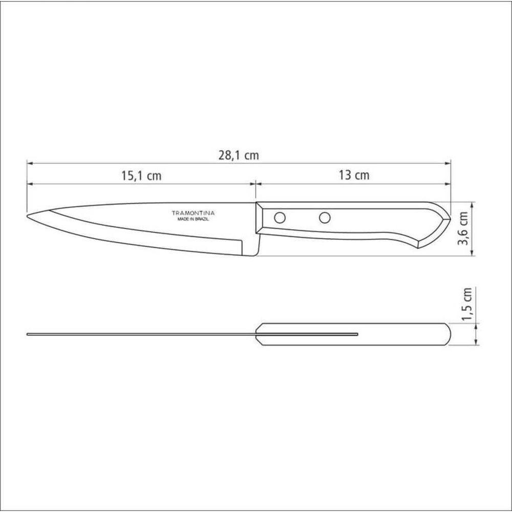 Faca Peixeira Tramontina 6 Dynamic Cabo Em MadeiraA Tramontina não deixa faltar uma boa faca para sua cozinha. A linhaUniversal, fabricada com lâminas de aço inox, é perfeita para descascarfrutas, cortar carnes, peixes e tudo o que você precisar. Cortes fáceise seguros para cozinhar com mais qualidade e prazer.Recomendações de Uso:Antes do uso: Antes de utilizar o , remova as eventuais etiquetas e lave-o com água e de uso:Durante a lavagem use somente esponja macia, outros tipos de produtos, como palha de aço, poderão riscar ou prejudicar o brilho do aço inox. Enxágue bem a peça a fim de remover totalmente os resíduos dos produtos de limpeza, que por serem abrasivos, podem danificar o inox. Após a lavagem enxugue a peça, pois as substâncias químicas contidas na água poderão causar manchas. Sempre que possível use água quente, pois renova o brilho do talher. Evite o das peças com superfícies quentes, pois podem provocar a descoloração do produto. Quando usar a máquina de lavar louça, recomendamos retirar o talher logo que tenha terminado o ciclo enxaguar, a fim de que os mesmos sejam secados manualmente.- Tenha cuidado ao Manusear produtos cortantes e perfurantes e mantenha-os fora do alcance de crianças.- Foto meramente ilustrativa.Informações Adicionais:- Cabo rústico e natural. fixado por Dois rebites de alumínio.- Lâmina de aço inox com Maior durabilidade do fio Devido ao tratamento térmico que recebe.- Permanece bonita por muito mais tempo.