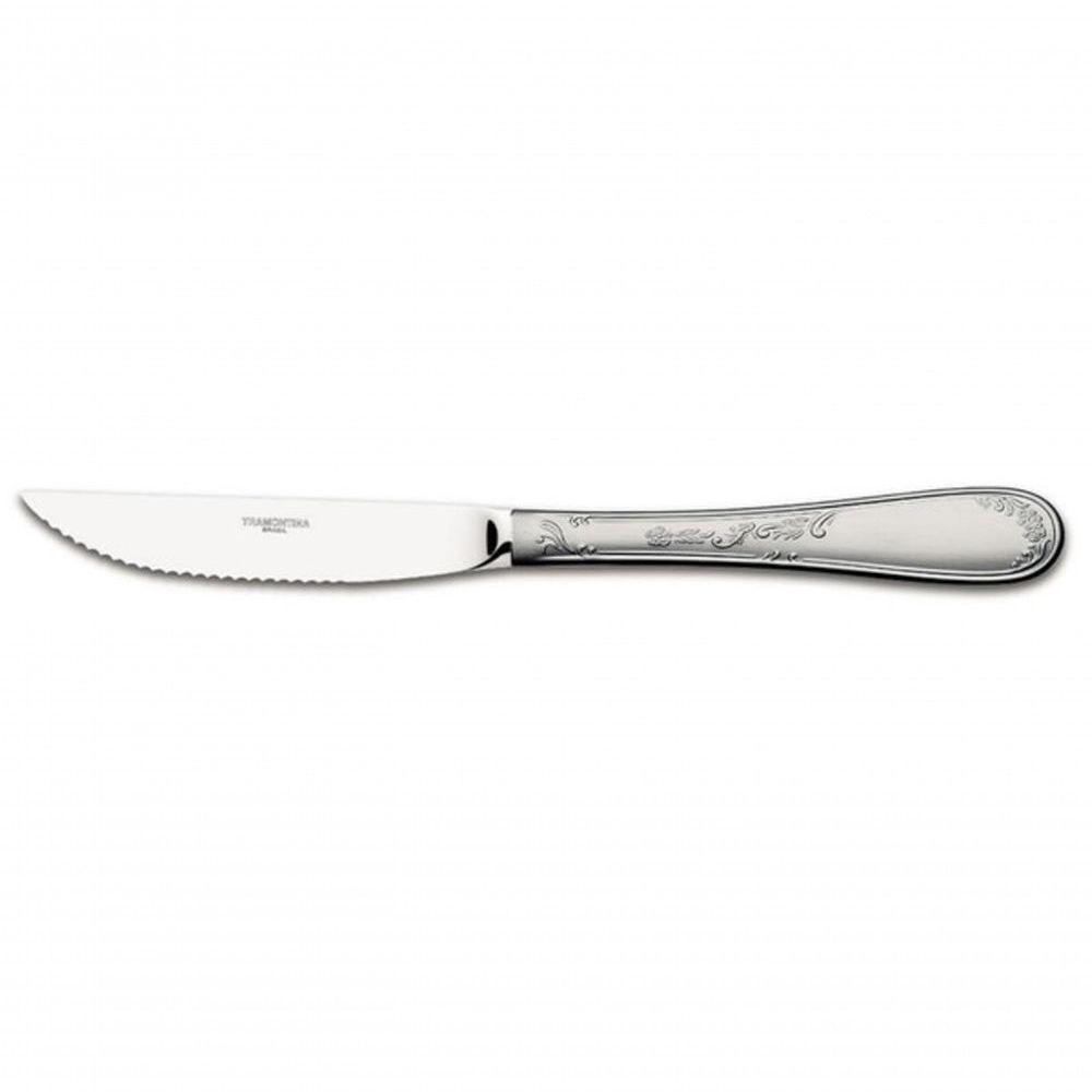 Faca Para Churrasco Tramontina Renascença Em Aço InoxUma mesa bem-posta é uma presente que todo mundo pode se dar todos os dias. Talheres e acessórios brilhantes, uma toalha bonita e pequenos toques de decoração tornam qualquer momento mais especial. Afinal, uma boa refeição deve ser saboreada também com os olhos.Recomendações de Uso:Antes do uso: Antes de utilizar o , remova as eventuais etiquetas e lave-o com água quente e de uso: Durante a lavagem use somente esponja macia, outros tipos de produtos, como palha de aço, poderão riscar ou prejudicar o brilho dos talheres. Enxágue bem cada peça a fim de remover totalmente os resíduos dos produtos de limpeza, que por serem abrasivos, podem danificar o inox. Após a lavagem enxugue os talheres, pois as substâncias químicas contidas na água poderão causar manchas. Sempre que possível use água quente, pois renova o brilho dos talheres. Evite o das peças com superfícies quentes, pois podem provocar a descoloração do produto. Quando usar a máquina de lavar louça, recomendamos retirar os talheres logo que tenha terminado o ciclo enxaguar, a fim de que os mesmos sejam secados manualmente.- Foto meramente ilustrativa.Informações Adicionais:- Em aço inoxidável, altamente durável, mantém as características , preservando a beleza, a higiene e a durabilidade do material.- Faca com lâmina temperada, proporcionando resistência à corrosão e durabilidade no fio de corte. Por sua característica de temperabilidade, não risca as porcelanas.- Linha de talheres Design Collection.- Design arrojado, com detalhes florais em alto-relevo.- Pode ser lavada, diariamente, à máquina de lavar louças.- Acabamento do aço inox em brilho Na Lâmina e em fosco no cabo.