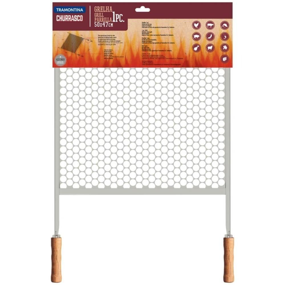 Grelha Tramontina Churrasco 83,5x47,1cm Em Aço Inox E Cabo De MadeiraChurrasqueiro bom é aquele que atende a todos os gostos. Carnes e legumes grelhados são unanimes: todo mundo Nada melhor que um belo churrasco para reunir amigos ou familiares. Então para o churrasqueiro fazer bonito e agradar a todos ele precisa ter a Grelha Aço Inox.Recomendações de Uso:Antes do Uso: Remova as ponteiras de proteção e lave a grelha usando apenas esponja e detergente ou sabão neutro, de uso: Não sobrecarregue a grelha, pois isso pode provocar deformações no produto. Retire o alimento com auxílio de um utensílio. É importante que a limpeza seja realizada imediatamente após o uso e que não permaneçam resíduos de alimentos na grelha. Caso o alimento esteja aderido, recomendamos o uso de escovas com cerdas de aço Tramontina que irão facilitar a limpeza. Sempre lave usando esponja e detergente ou sabão neutro. Seque a grelha imediatamente após a lavagem para evitar aparecimento de manchas. Ao utilizar utensílios quentes, tenha cuidado redobrado. Se necessário utilize proteção para as mãos e mantenha-os fora do alcance das crianças.Informações Adicionais:- Cabo de madeira natural; - Grelha plana com estrutura em aço inox.- Foto meramente ilustrativa.