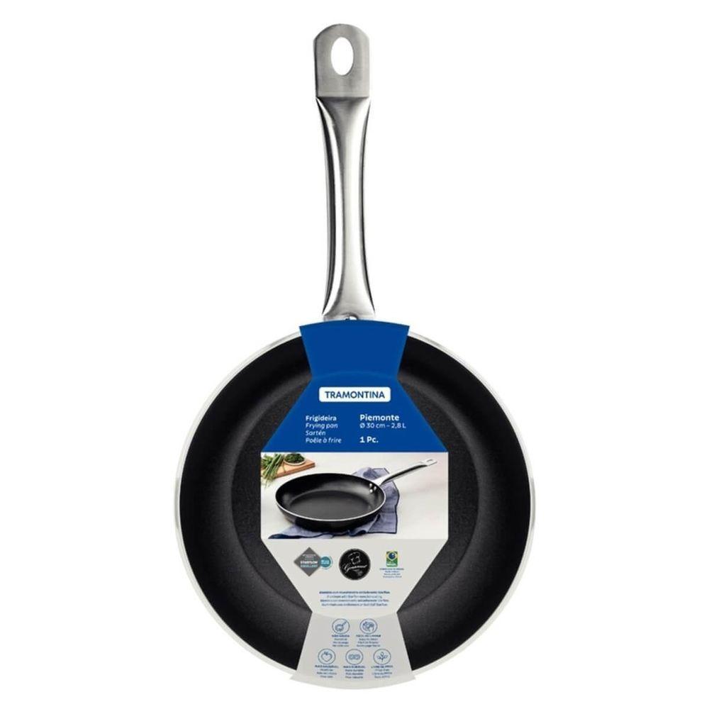 Frigideira Tramontina Piemonte 30cm Em Alumínio E Revestimento Antiaderente PretaParceira perfeita para suas aventuras culinárias, a frigideira Tramontina Piemonte em alumínio com revestimento interno e externo em antiaderente Starflon Excellent preto 30 centímetros de diâmetro 2,8 litros, foi desenvolvida para que você possa preparar ;refeições incríveis com maior praticidade e funcionalidade. Ela proporciona um cozimento rápido e uniforme dos alimentos, evitando que eles grudem na superfície, permitindo que você prepare seus pratos favoritos com facilidade e desfrute de uma limpeza simples e prática. O cabo de aço inox é resistente e oferece durante o manuseio, permitindo que você cozinhe com confiança, precisão e estabilidade. Aprimore sua experiência na cozinha e crie um mundo de possibilidades!Recomendações de Uso:Antes do Uso: A capacidade volumétrica máxima para cozimento é de ¾ da capacidade total da peça. Antes do primeiro uso, lave com esponja macia, sabão neutro ou detergente líquido. Depois de secar, unte a área interna com óleo ou gordura e leve ao fogo por um ou dois minutos. Deixe esfriar e lave novamente.Modo de Uso: Posicione os cabos dos utensílios voltados ao centro do fogão. Em fogões com grade, centralize as peças sobre a chama ou fonte de calor e alinhe os cabos com a grade. Utensílios quentes devem estar fora do alcance das crianças. Para mexer os alimentos use somente utensílios de silicone, nylon ou madeira. Para descarte dos produtos e embalagem siga as orientações de reciclagem vigentes.- Foto meramente ilustrativa.Informações Adicionais:- Livre de PFOA;- Cabo de aço inox;- Corpo de alumínio;- Podem ir à máquina de lavar louças facilitando seu dia a dia;- Revestimento interno e externo de antiaderente Starflon Excellent;- Este produto pode ser levado ao forno para gratinar ou finalizar pratos, na temperatura máxima de 260 °C, podendo haver mudança na coloração do cabo. ;