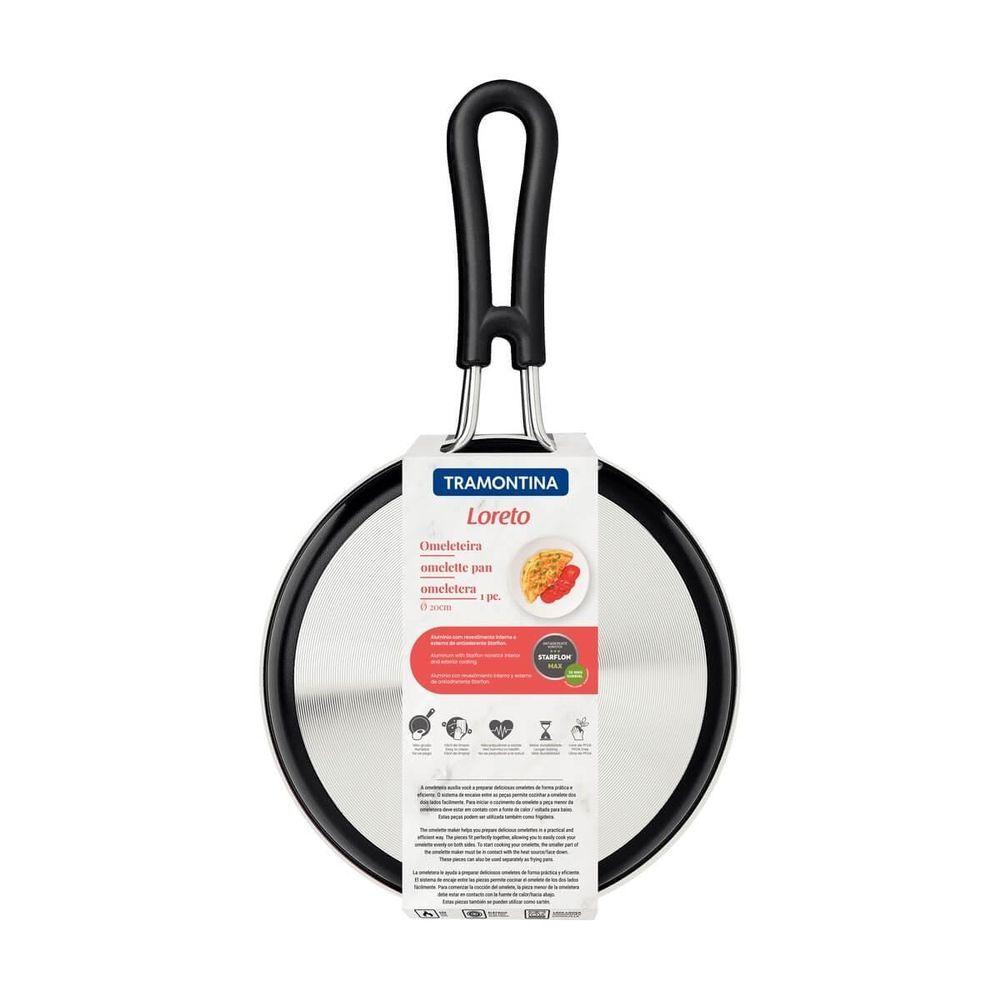 Omeleteira Tramontina Loreto Em Alumínio 24cm GrafiteSe você e sua família amam aquele omelete cremoso e fofinho, precisa contar com a omeleteira Tramontina Loreto em alumínio com revestimento interno e externo em antiaderente Starflon Max grafite 24 centímetros de diâmetro. Seu corpo é produzido em alumínio com espessura que cozinha os ingredientes de maneira uniforme e conta com revestimento em Starflon Max, característica que evita que os alimentos grudem em sua superfície e a torna fácil de limpar. Além dessas características, ela ainda é durável, não prejudicial à saúde e proporciona um manuseio muito confortável e , pois seus cabos são em baquelite antitérmico, material que não aquece. Uma omeleteira resistente, que pode ir à máquina de lavar louças e é indispensável para sua cozinha!Recomendações de Uso:Antes do Uso: Lave com esponja macia, sabão neutro ou detergente líquido. Depois de secar, unte a área interna com óleo ou gordura e leve ao fogo por um ou dois minutos. Deixe esfriar e lave novamente. Seu utensílio Starflon está pronto para uso, sempre em fogo baixo ou médio (nunca superior a 260 °C).Modo de Uso: ;Para mexer os alimentos use somente utensílios de silicone, nylon ou madeira. Este produto não necessita de manutenção, apenas limpeza. ;Evite a imersão do utensílio quente em água fria. Nunca utilize produtos abrasivos na lavagem. Se deixar queimar alimentos, umedeça a área e reserve até que possa remover os resíduos grudados com esponja e sabão. ;Informações Adicionais:- Podem ir à máquina de lavar louças facilitando seu dia a dia;- Cabos de baquelite antitérmico que oferecem durante o manuseio;- A capacidade volumétrica máxima para cozimento é de 3/4 da capacidade total da peça;- Corpo de alumínio com espessura de 1,6 mm que proporciona cozimento rápido e uniforme;- Revestimento interno e externo de antiaderente Starflon Max que não gruda, é fácil de limpar, mais durável e não é prejudicial à saúde, pois é livre de PFOA.- Foto meramente ilustrativa.