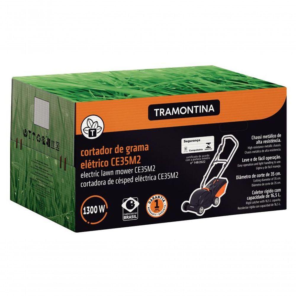 Cortador De Grama Elétrico Tramontina Ce35m2 Em Metal Com Coletor Rígido 1300w 220vO Cortador de Grama Elétrico Tramontina CE35M2 1300 W 220 V, com diâmetro de corte de 350 mm, coletor rígido e chassi metálico, vai transformar o cuidado com o seu gramado. Com design moderno e inovador, ele alia alto desempenho e , garantindo cortes precisos e uniformes. Leve e prático, oferece operação ágil e armazenamento facilitado, ocupando pouco espaço. Uma solução eficiente para deixar o jardim sempre bonito e bem cuidado, tornando os momentos em família ainda mais agradáveis ao ar livre.Recomendações de Uso:Para qualquer operação de manutenção e controle, o cabo elétrico deve estar desligado da tomada. Nunca trabalhe com o cortador sob chuva ou em gramados molhados e utilize-o sempre durante o dia ou com boa iluminação. Inspecione o cabo elétrico periodicamente. Nunca remende o mesmo. Recomenda-se que as peças de reposição sejam do mesmo modelo e da marca Tramontina.Antes do uso: Antes de usar o equipamento, leia atentamente o manual de uso e manutenção. Retire do terreno pedras, tocos e outros objetos.Modo de uso: Antes de ligar o equipamento, verifique se a tensão do cortador está de acordo com a tensão da rede elétrica. Para a sua e para evitar que o cabo elétrico se desconecte do plug, enquanto o trabalho estiver sendo executado, conecte o cabo elétrico ao fixa-cabo do cortador de grama. Em gramados muito altos, procure fazer primeiro um pré-corte da grama com a regulagem de corte alto e somente depois o corte na altura definitiva. Isso facilita o trabalho e não sobrecarrega o motor. ;Durante o uso, mantenha crianças e animais à distância do cortador quando ele estiver em operação. Durante o trabalho, use sempre calçados fechados. Não permita que pessoas inexperientes usem o cortador sem antes ler o manual de instruções. Sempre, após um impacto mais forte com algum obstáculo, a lâmina deve ser retirada e examinada cuidadosamente. Se houver necessidade, deve ser trocada por outra nova. Procure conduzir o cabo elétrico por trás do cortador e sempre pelo lado já cortado da grama. Evite acúmulo de grama embaixo do cortador. ;Para descarte dos produtos e embalagens siga as orientações de reciclagem vigentes.Após o uso: ;Limpe o cortador usando escova ou um pano umedecido com água. Nunca despeje água sobre o cortador. Quando não utilizado, o cortador deve ser armazenado fora do alcance das crianças.- Foto meramente ilustrativa.Informações Adicionais:- Produto fabricado no ;- Diâmetro de corte de 350 mm;- Alça para facilitar o ;- Braço metálico, com isolamento;- Interruptor de duplo acionamento;- Chassi metálico de alta resistência;- Área de corte indicada de m²;- Motor com 1300 W de potência, 220 V, 60 Hz;- Rede de Assistência Técnica em todo o ;- Três alturas de corte: 23 mm, 38 mm e 53 mm;- Cesto coletor rígido com capacidade de 16,5 L;- Prático sistema de regulagem da altura de corte;- Fixa-cabo, evita que o cabo elétrico desconecte do plug;- Lâmina posicionada acima do nível do chassi, evitando que objetos sejam lançados em direção ao operador e pessoas próximas;- Peças metálicas possuem pintura eletrostática a pó, que tem uma melhor apresentação visual e maior proteção contra oxidação.