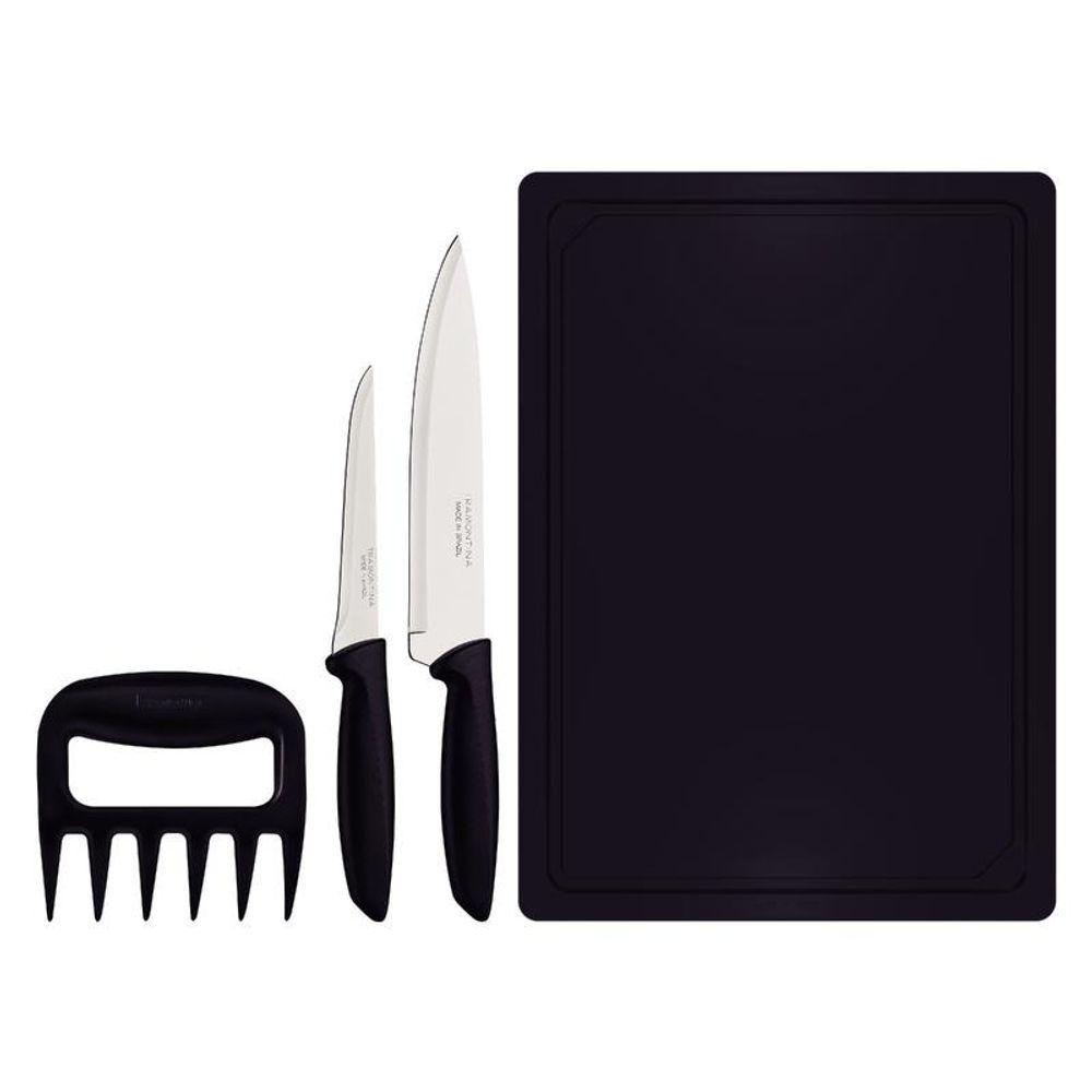 Jogo De Facas Tramontina Plenus Em Aço Inox E Cabos De Polipropileno Preto 4 PeçasO jogo de facas Tramontina Plenus é um aliado indispensável na cozinha, unindo versatilidade e praticidade. Com lâminas em aço inox e cabos de polipropileno preto, oferece durabilidade e conforto no manuseio. O conjunto inclui duas facas, uma garra multiuso e uma tábua de corte em polipropileno preto, ideal para preparar carnes, legumes e outros ingredientes com precisão. Além de resistentes, as peças são fáceis de limpar e podem ser levadas à máquina de lavar louças, tornando o dia a dia mais prático e eficiente.Recomendações de Uso:Modo de Uso: ;Antes da primeira utilização, lave bem as peças e seque-as. Tenha cuidado ao manusear produtos cortantes e perfurantes e mantenha-os fora do alcance de crianças. Para maior durabilidade dos produtos, recomenda-se secar bem antes de guardar, mesmo após lavagem em máquina. Para descarte dos produtos e embalagens siga as orientações de reciclagem vigentes.- Foto meramente ilustrativa.Informações Adicionais:- Podem ir à máquina de lavar louças facilitando seu dia a dia;- Os cabos de polipropileno possuem maior resistência e durabilidade;- As lâminas de aço inox têm maior durabilidade do fio devido ao tratamento térmico.