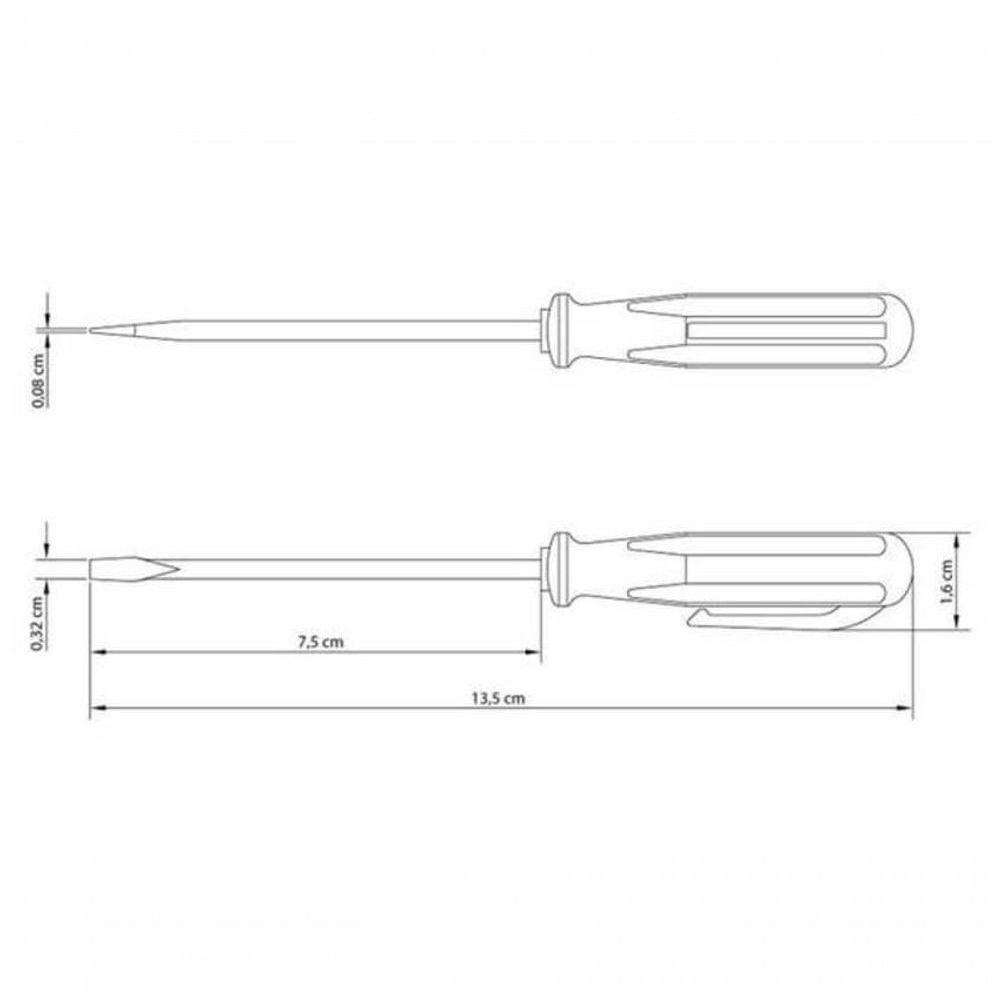 Chave De Fenda Clipe Tramontina Master Yellow 1/8x3" Com Ponta Chata A Chave de Fenda Clipe Tramontina MASTER Yellow com Ponta Chata 1/8x3 Polegadas traz mais praticidade para o seu dia a dia. Seu cabo em polipropileno injetado possui uma alça prática, que não compromete o conforto na empunhadura e permite prender a ferramenta em cintos, bolsas ou outros locais conforme a necessidade. A haste em aço temperado garante alta resistência e durabilidade, proporcionando um trabalho eficiente. Com ela, apertar e afrouxar parafusos ficou ainda mais fácil!Recomendações de Uso:Modo de uso: ;Use óculos, luvas e outros equipamentos de proteção de acordo com a tarefa a ser executada. Utilize chaves de fenda isoladas, identificadas pela marcação V, quando for necessário trabalhar em locais com corrente elétrica. Importante: nestes casos, inspecione a integridade da isolação elétrica, e, se aparecerem trincas na isolação, suspenda o uso imediatamente. Utilize chaves com ponta adequada para cada tipo de fenda, para realizar a tarefa de forma mais rápida e segura. Respeite o torque estabelecido por norma para cada bitola. Não utilize as chaves de fenda como formão ou alavanca. Não altere as dimensões da ponta para obter outro perfil. Armazene em limpo e seco.- Foto meramente ilustrativa.Informações Adicionais:- Acabamento niquelado;- Haste em aço especial temperado;- ;Cabos injetados com material de alta resistência;- ;As ferramentas são produzidas e testadas conforme normas específicas;- ;Os dimensionais das pontas são verificados com gabaritos padrão, calibrados e certificados;- As hastes das chaves de fendas são testadas em máquinas de ensaios ;específicas, para verificar o perfeito balanço entre resistência mecânica e dureza.