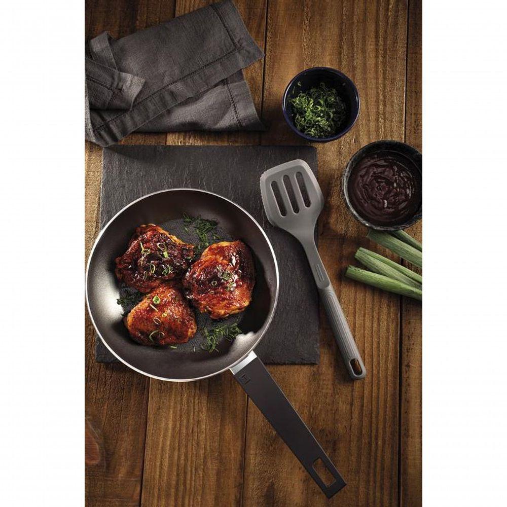 Espátula Tramontina Softta Vazada Em Silicone CinzaPrepare receitas com mais leveza e confiança usando a espátula vazada Tramontina Softta em silicone cinza. Ideal para panelas com revestimento antiaderente, ela evita danos ao fundo dos utensílios e suporta até 210 °C sem perder a forma. Seu cabo anatômico oferece firmeza no manuseio, enquanto o silicone de alta qualidade facilita o preparo de alimentos delicados. Depois do uso, basta colocar na lava-louça para simplificar a limpeza. Um item essencial para quem valoriza conforto, resistência ao calor e utensílios que acompanham o ritmo da cozinha do dia a dia.Recomendações de Uso:Modo de uso: ;Antes da primeira utilização, lave bem a peça e seque-a. Não utilizar esponja abrasiva para limpeza e para maior durabilidade do produto recomenda-se secar bem antes de guardar, mesmo após lavagem em máquina. O produto pode sofrer alterações no aspecto visual ao longo do uso, em virtude da pigmentação dos alimentos e degradação natural da cor do utensílio. Não deixar o utensílio em superfícies quentes por tempo prolongado. Não armazenar o utensílio junto a materiais cortantes e perfurantes. Para descarte do produto e embalagem siga as orientações de reciclagem vigentes.- Foto meramente ilustrativa.Informações Adicionais:- Pode ir à máquina de lavar louças facilitando seu dia a dia;- Espátula de silicone, que resiste até uma temperatura de 210 °C;- Com furo passante no cabo possibilitando que seja pendurado na sua cozinha;- Utensílio ideal para uso em panelas com revestimentos antiaderentes e cerâmicos, pois não danifica o produto.