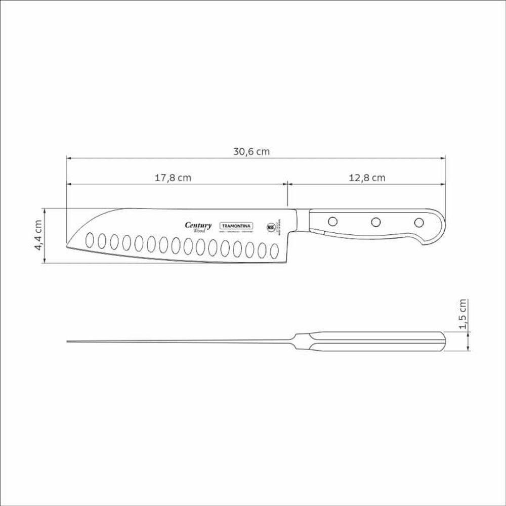 Faca Santoku Tramontina 7 Century Wood CastanhoImagine pratos incríveis e crie-os com maestria usando a Faca Santoku Tramontina Century Wood, com lâmina de aço inox e cabo de madeira tratada castanho de 7 polegadas. Combinando a elegância do cabo de madeira tratada com a durabilidade da lâmina forjada em aço inox especial, essa faca é perfeita para profissionais e entusiastas culinários que buscam qualidade e precisão em cada corte. O cabo, fixado por rebites de aço inox, oferece maior conforto e durante o manuseio, garantindo firmeza e controle em cada utilização. Além disso, a faca pode ser levada à máquina de lavar louças, proporcionando maior praticidade no seu dia a dia na cozinha. Experimente a perfeição em cada corte com a Faca Santoku Tramontina Century Wood e eleve sua experiência culinária a um patamar!Recomendações de Uso:Modo de Uso: Antes da primeira utilização, lave bem a peça e seque-a. Produto cortante e perfurante: tenha cuidado ao manusear e mantenha fora do alcance das crianças. Para maior durabilidade do produto recomenda-se secar bem antes de guardar, mesmo após lavagem em máquina. Recomenda-se o uso de tábuas de polipropileno ou madeira da Tramontina para maior durabilidade do fio da faca. Não é indicado o uso da faca para o corte de alimentos congelados. Mantenha sempre sua faca afiada utilizando os afiadores da Tramontina. Para descarte dos produtos e embalagens siga as orientações de reciclagem vigentes.- Foto meramente ilustrativa.Informações Adicionais:- Ideal para cortar, fatiar e picar;- Resistente a impactos e a altas temperaturas;- Cabo de madeira tratada com rebites de aço inox;- Pode ir à máquina de lavar louças facilitando seu dia a dia;- A lâmina forjada de aço inox especial garante um fio com maior durabilidade e precisão.