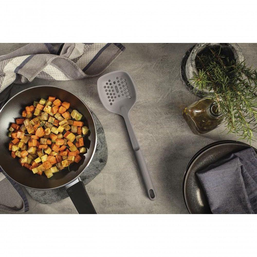 Escumadeira Tramontina Softta Cinza Em Silicone Tornar o preparo das refeições mais simples começa com os utensílios certos. A escumadeira Tramontina Softta em silicone cinza foi feita para quem busca eficiência sem abrir mão do cuidado com as panelas. com superfícies antiaderentes, ela suporta até 210 °C e é perfeita para retirar alimentos da água ou do óleo com . O material em silicone evita riscos, enquanto o cabo anatômico garante firmeza no uso. Após o uso, basta levar à lava-louça para uma limpeza prática. Um item que acompanha sua rotina com leveza e praticidade.Recomendações de Uso:Modo de uso: Antes da primeira utilização, lave bem a peça e seque-a. Não utilizar esponja abrasiva para limpeza e para maior durabilidade do produto recomenda-se secar bem antes de guardar, mesmo após lavagem em máquina. O produto pode sofrer alterações no aspecto visual ao longo do uso, em virtude da pigmentação dos alimentos e degradação natural da cor do utensílio. Não deixar o utensílio em superfícies quentes por tempo prolongado. Não armazenar o utensílio junto a materiais cortantes e perfurantes. Para descarte do produto e embalagem siga as orientações de reciclagem vigentes.- Foto meramente ilustrativa.Informações Adicionais:- Pode ir à máquina de lavar louças facilitando seu dia a dia; - Espumadeira de silicone, que resiste até uma temperatura de 210 °C; - Cabo de polipropileno com furo passante possibilitando que seja pendurado na sua cozinha; - Utensílio ideal para uso em panelas com revestimentos antiaderentes e cerâmicos, pois não danifica o produto.
