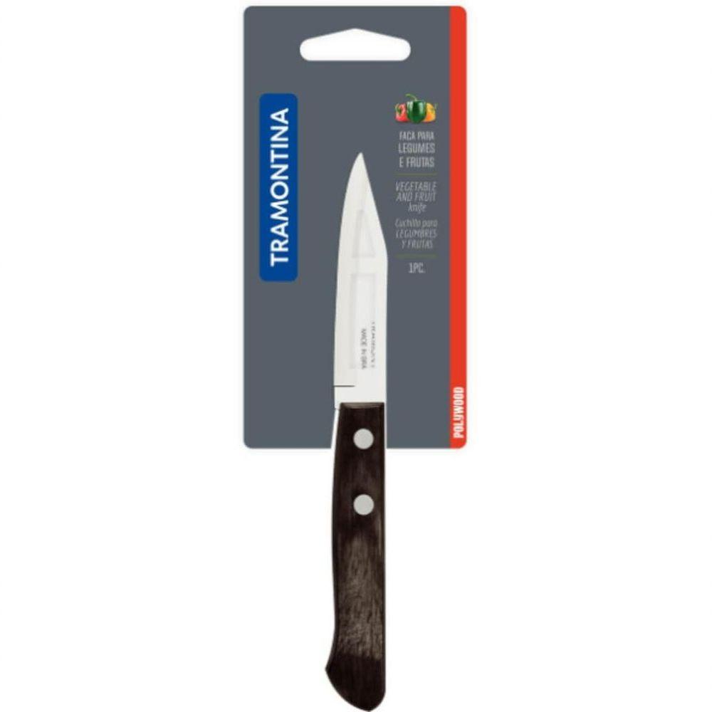 Faca Para Legumes E Frutas 3 Castanho Tramontina PolywoodVocê irá se surpreender com a Faca para Legumes e Frutas Tramontina Polywood com Lâmina em Aço Inox e Cabo de Madeira Castanho 3 polegadas da Linha Polywood. Desenvolvida para lhe garantir uma rotina ainda mais prazerosa, além de tornar a sua cozinha mais eficiente. Ideal para cortar, descascar e fazer cortes delicados que envolvem legumes e frutas, ela é produzida com lâmina em aço inox, garantindo maior resistencia e durabilidade. Além disso, o cabo em madeira tratada Polywood oferece muito mais do que beleza, proporcionando um manuseio confortável, resistente à altas temperaturas e à impactos. Tenha facas de qualidade em sua cozinha!Recomendações de Uso:Antes do uso: Antes de utilizar o , remova as eventuais etiquetas e lave-o com água e detergente.Modo de uso: Durante a lavagem use somente esponja macia, outros tipos de produtos, como palha de aço, poderão riscar ou prejudicar o brilho do aço inox. Enxágue bem a peça a fim de remover totalmente os resíduos dos produtos de limpeza, que por serem abrasivos, podem danificar o inox. Após a lavagem enxugue a peça, pois as substâncias químicas contidas na água poderão causar manchas. Sempre que possível use água quente, pois renova o brilho do talher. Evite o das peças com superfícies quentes, pois podem provocar a descoloração do produto. Quando usar a máquina de lavar louça, recomendamos retirar o talher logo que tenha terminado o ciclo enxaguar.Informações Adicionais:- Rebites de alumínio;- Ideal para cortar, descascar e fazer cortes delicados;- Pode ir à máquina de lavar louças facilitando seu dia a dia;- A lâmina de aço inox têm maior durabilidade do fio devido ao tratamento térmico;- O cabo de madeira tratada Polywood é resistentes à impactos e alta temperaturas garantindo maior resistência e durabilidade.- Foto meramente ilustrativa. ;