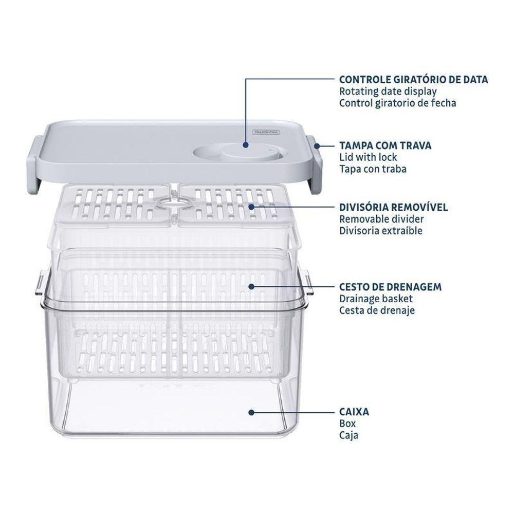 Pote Tramontina Organizador De Geladeira Organizzare 6,2 Litros Com Controle De Umidade Para quem precisa armazenar grandes volumes com praticidade e cuidado, o pote organizador de geladeira Tramontina Organizzare com controle de umidade 6,2 L é a escolha certa. Com espaço de sobra e tampa com ventilação ajustável, ele ajuda a preservar frutas, legumes, carnes e laticínios por mais tempo, mantendo sabor, frescor e textura. O cesto de drenagem evita o direto com a umidade, enquanto o divisor removível permite organizar os alimentos de forma versátil. O controle de data giratório facilita o acompanhamento do tempo de conservação. Com design inteligente e eficiente, esse pote é um aliado indispensável para quem busca otimizar o espaço da geladeira e simplificar a rotina na cozinha.Recomendações de Uso:Modo de Uso: ;Confira o produto para garantir que ele não tenha sido durante o . Lave o produto com água e detergente neutro antes de usar. Use apenas sabão ou detergente e uma esponja macia. Outros tipos de produto, como palha de aço, poderão riscar ou prejudicar o brilho das peças. Evite batidas que possam ocasionar trincas ou quebras no produto. Não jogar água fervente diretamente sobre o organizador.- Foto meramente ilustrativa.Informações Adicionais:- Design de fluxo de ar aprimorado;- A função giratória do mostrador de data torna fácil definir o período de armazenamento.- Usando o divisor removível, o cesto de drenagem pode alternar entre dois estados de divisão: esquerda-direita e superior-inferior;- Possui bandeja de drenagem que impede que a umidade acumulada se mantenha no alimento, evitando o murchamento e a deterioração precoce;- Ventilação e umidade controladas: a tampa com ventilação ajustável mantém o nível ideal de umidade para cada tipo de alimento, mantendo-os frescos por mais tempo.