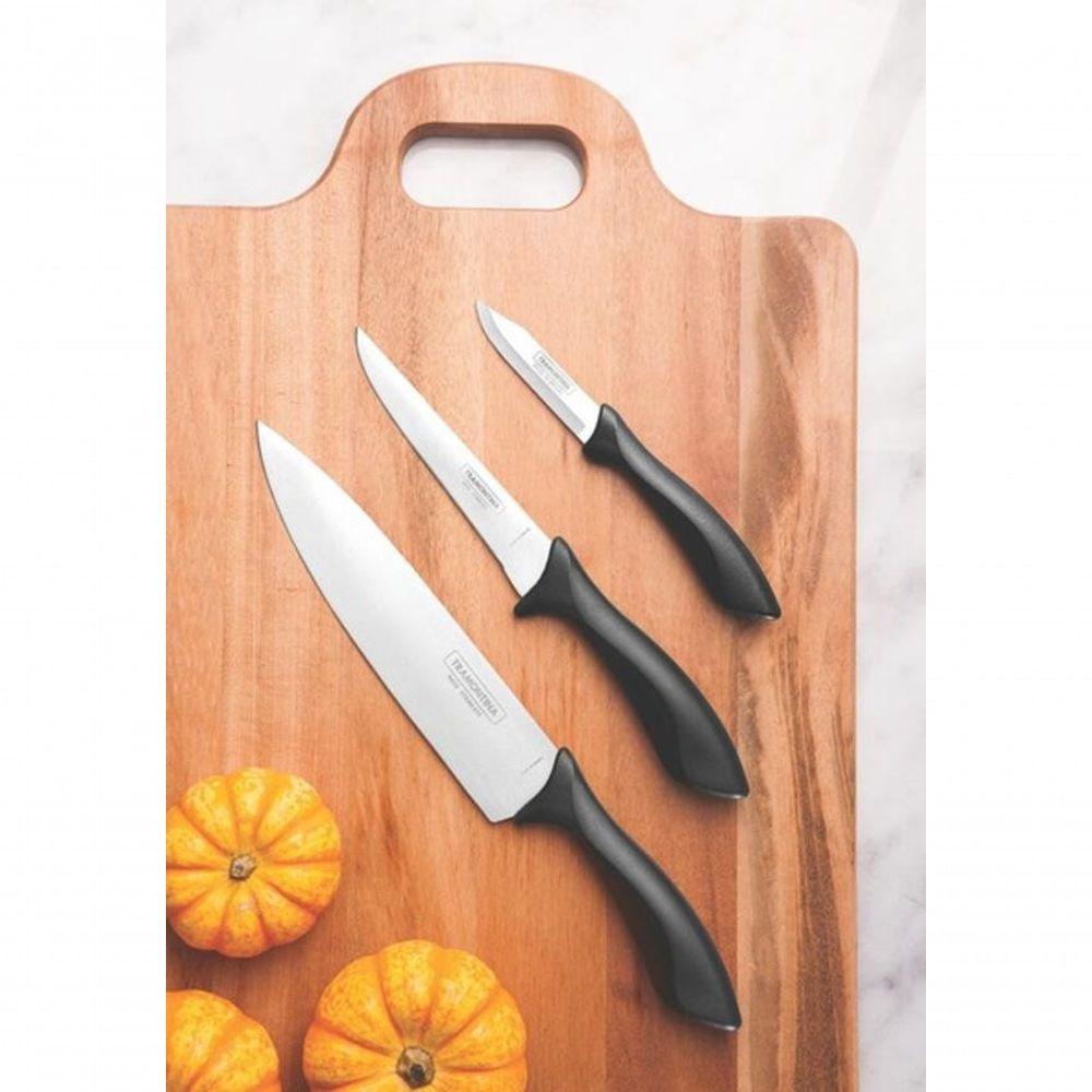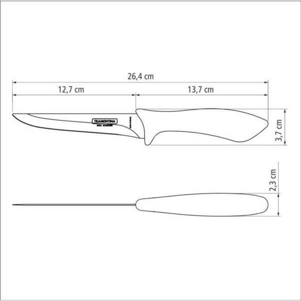 Faca Para Desoccar Tramontina Affilata 5 Inox PretaA praticidade e a ergonomia fazem da linha Affilata a escolha certa para quem tem prazer de caprichar no preparo dos ingredientes.Recomendações de Uso:Modo de uso: antes da primeira utilização, remova as eventuais etiquetas e lave usando apenas uma esponja macia, sabão ou detergente neutro. Outros tipos de produtos, como palha de aço, poderão riscar ou prejudicar o acabamento da peça. Enxágue cada item a fim de remover totalmente os resíduos dos produtos de limpeza, que, por serem abrasivos, podem danificar o inox. Após a lavagem enxaguar e secar bem a peça, caso contrário, as substâncias químicas da água (cloro) poderão causar manchas. Para maior durabilidade dos produtos recomenda-se secar bem antes de guardar, mesmo após lavagem em máquina. Evite o direto da peça com superfícies quentes, pois poderá provocar deformações ao produto. Evite atrito entre as peças durante o processo de lavagem e no armazenamento, para mantê-la sem riscos.- Tenha cuidado ao Manusear produtos cortantes e perfurantes e mantenha-os fora do alcance de crianças.- Foto meramente ilustrativa.Informações Adicionais:- Lâmina em aço inox.- Cabo de polipropileno.- a Espessura do aço e formato da peça evita deformações.- A faca recebe tratamento térmico especial, o que dá maior durabilidade ao fio.- Pode ser levada à máquina de lavar.